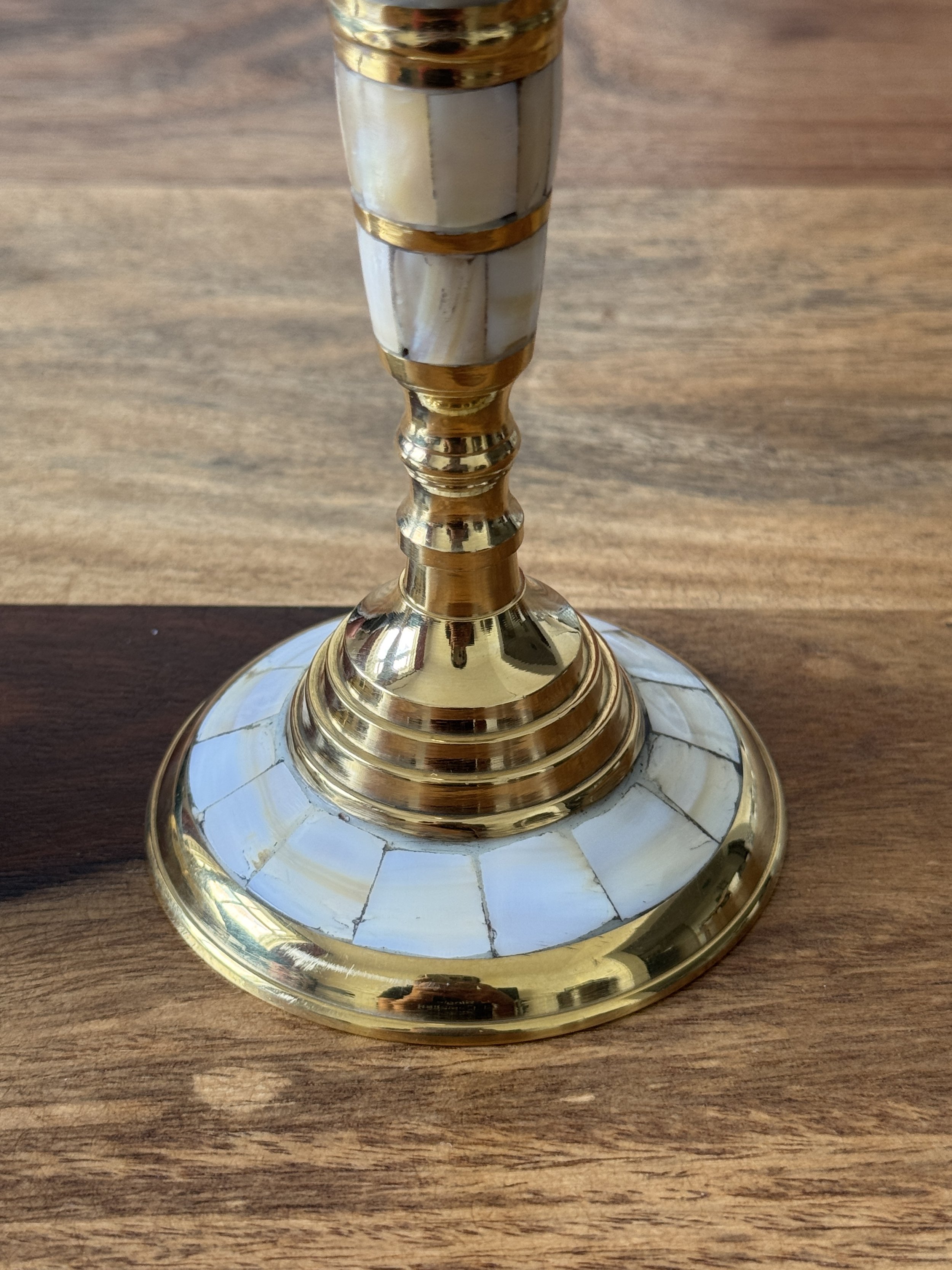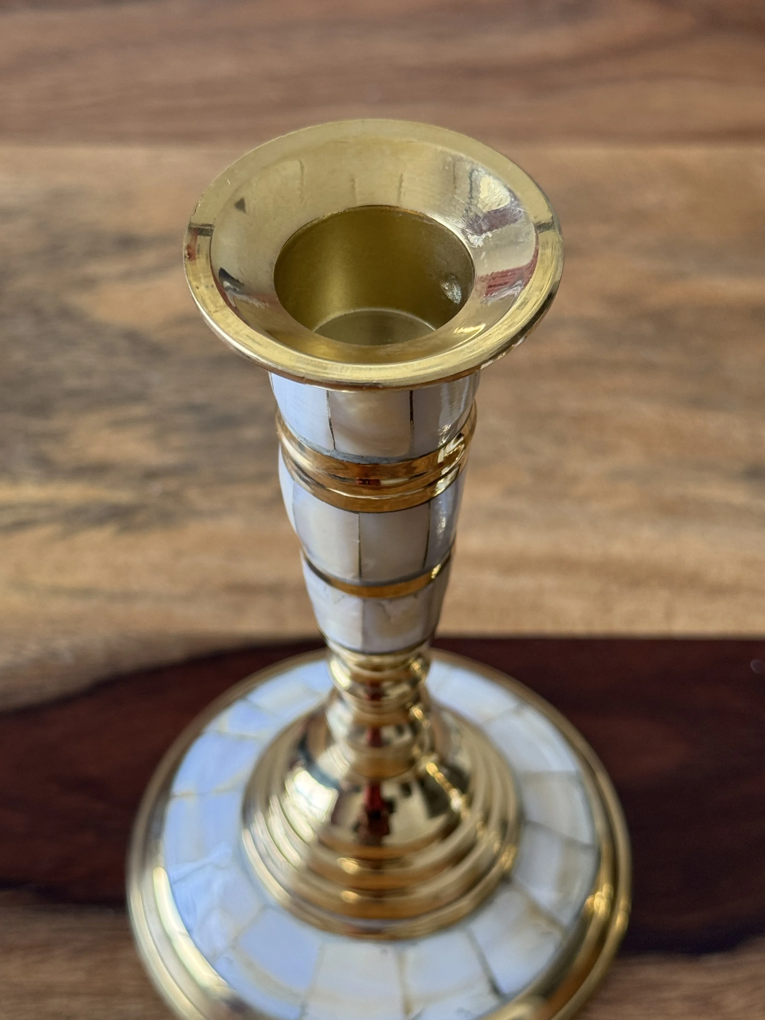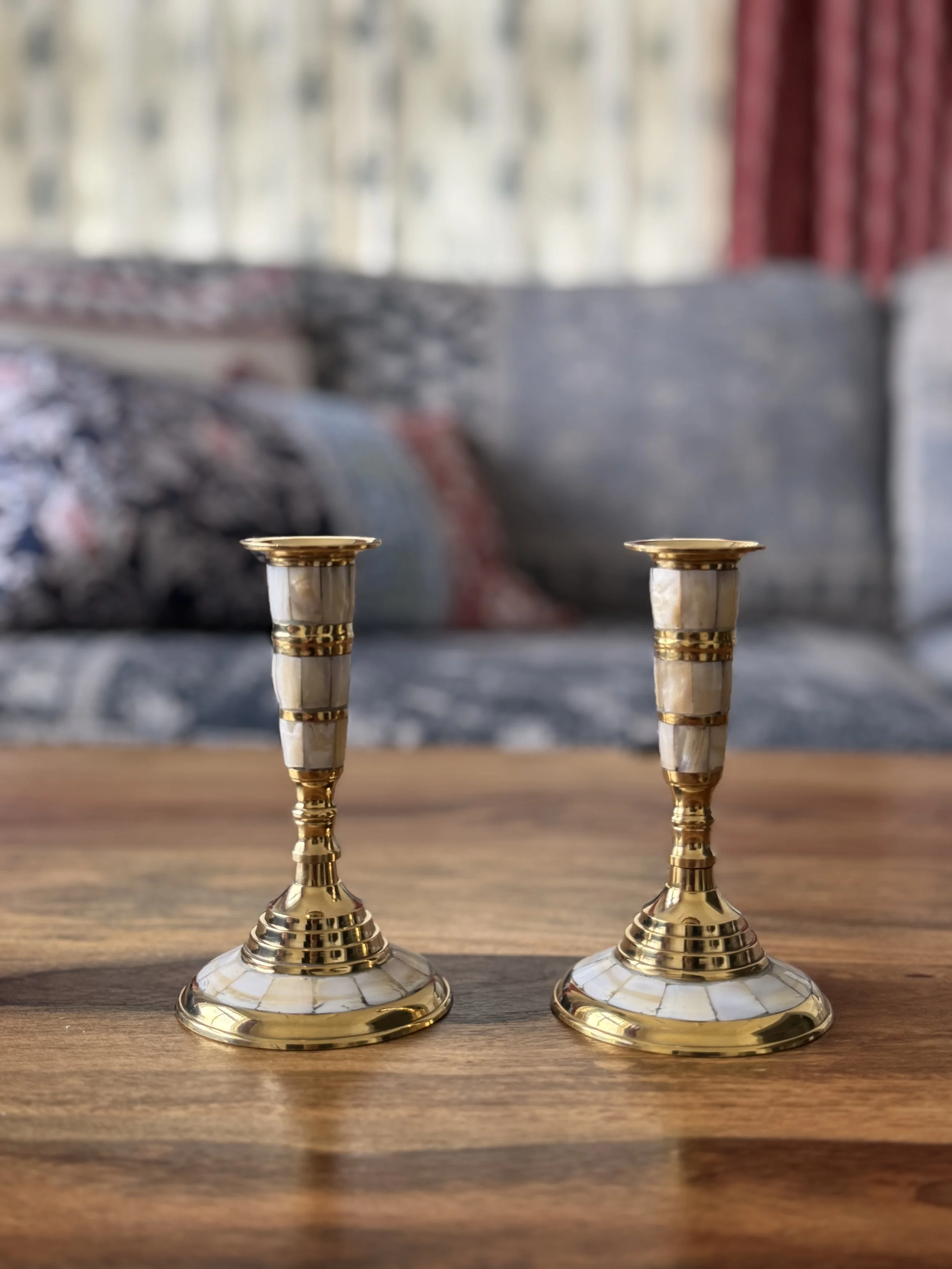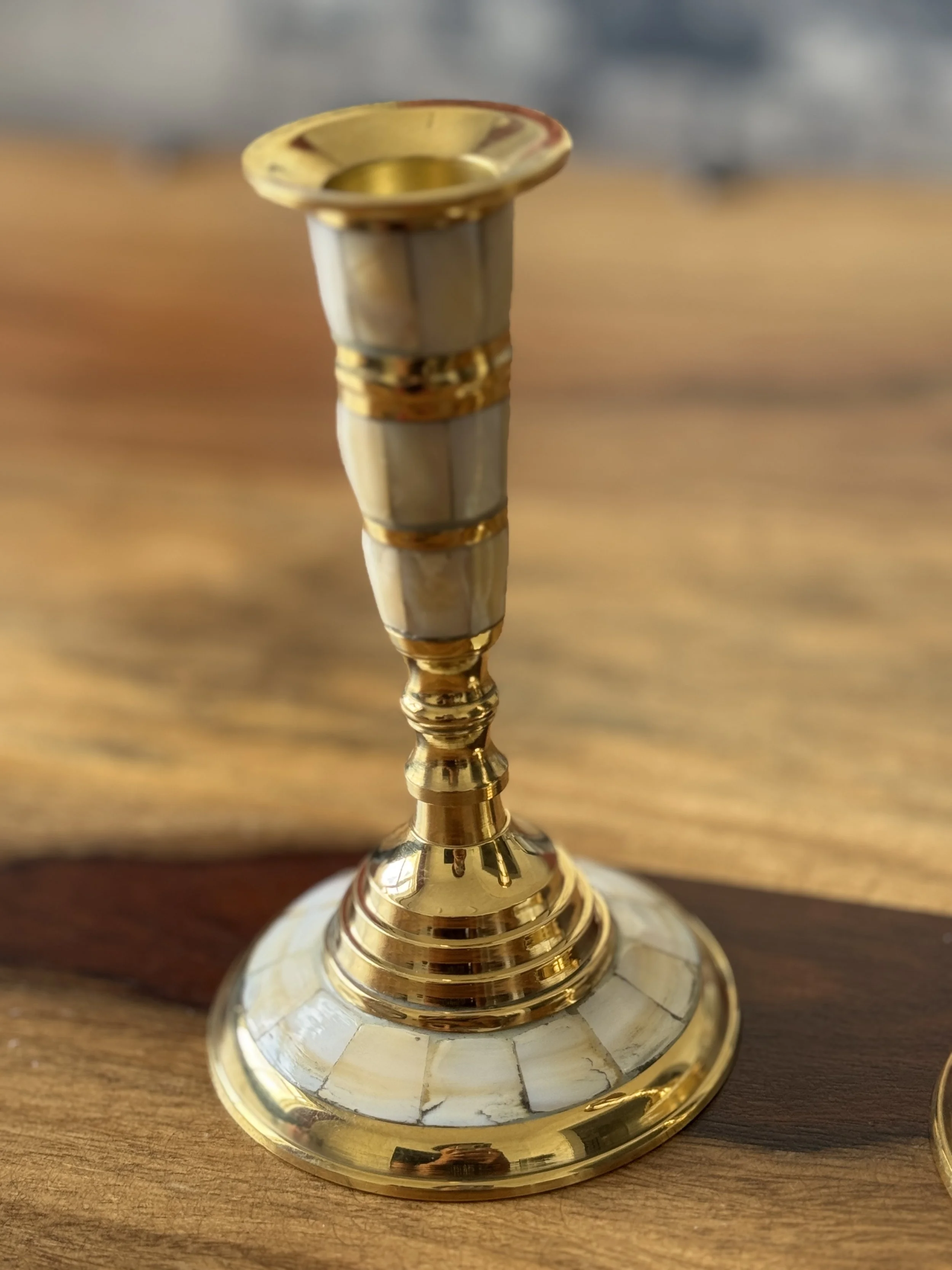 Crafted in durable brass and adorned with mother-of-pearl inlay, the candlestick holders are ideal for tapered candles.