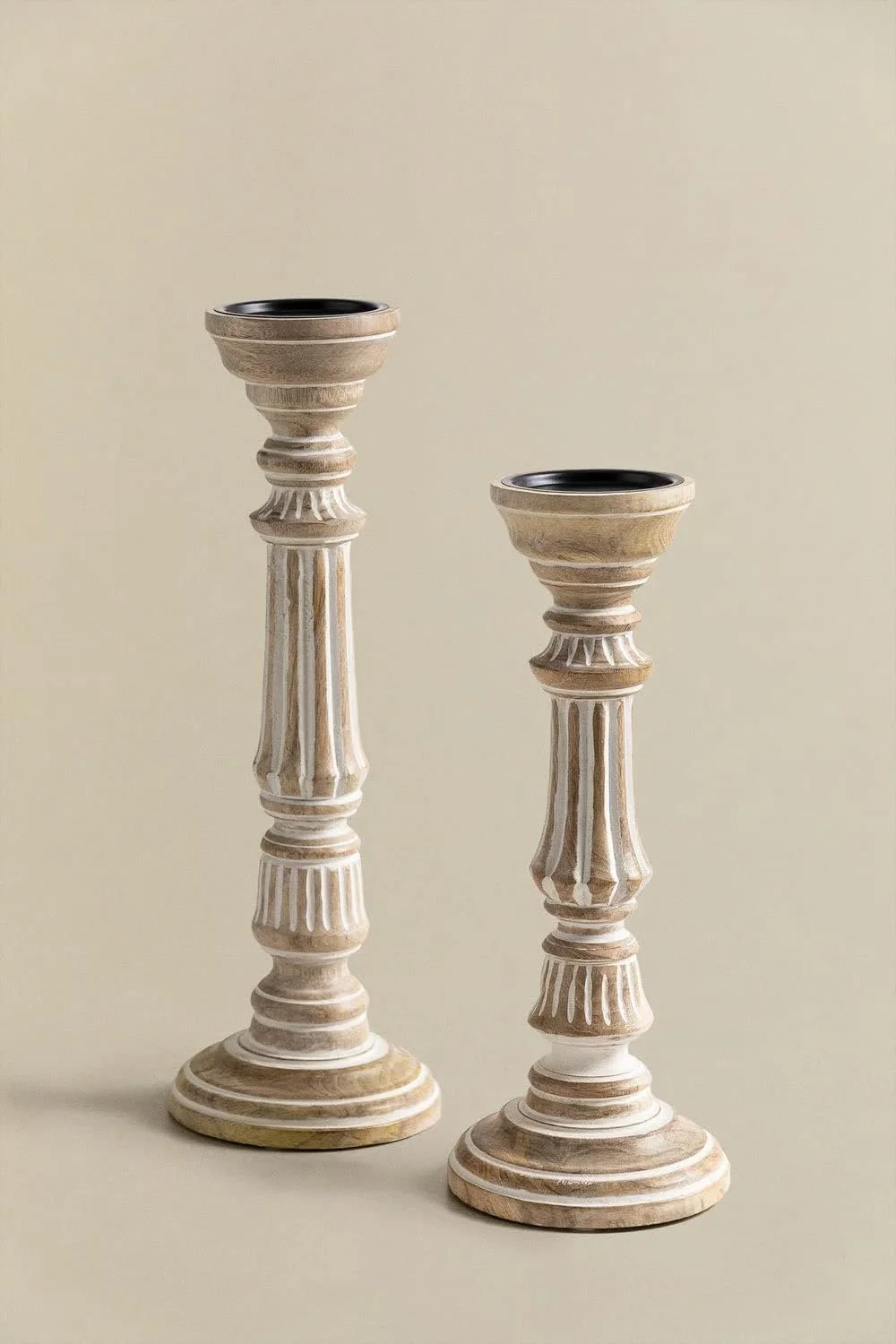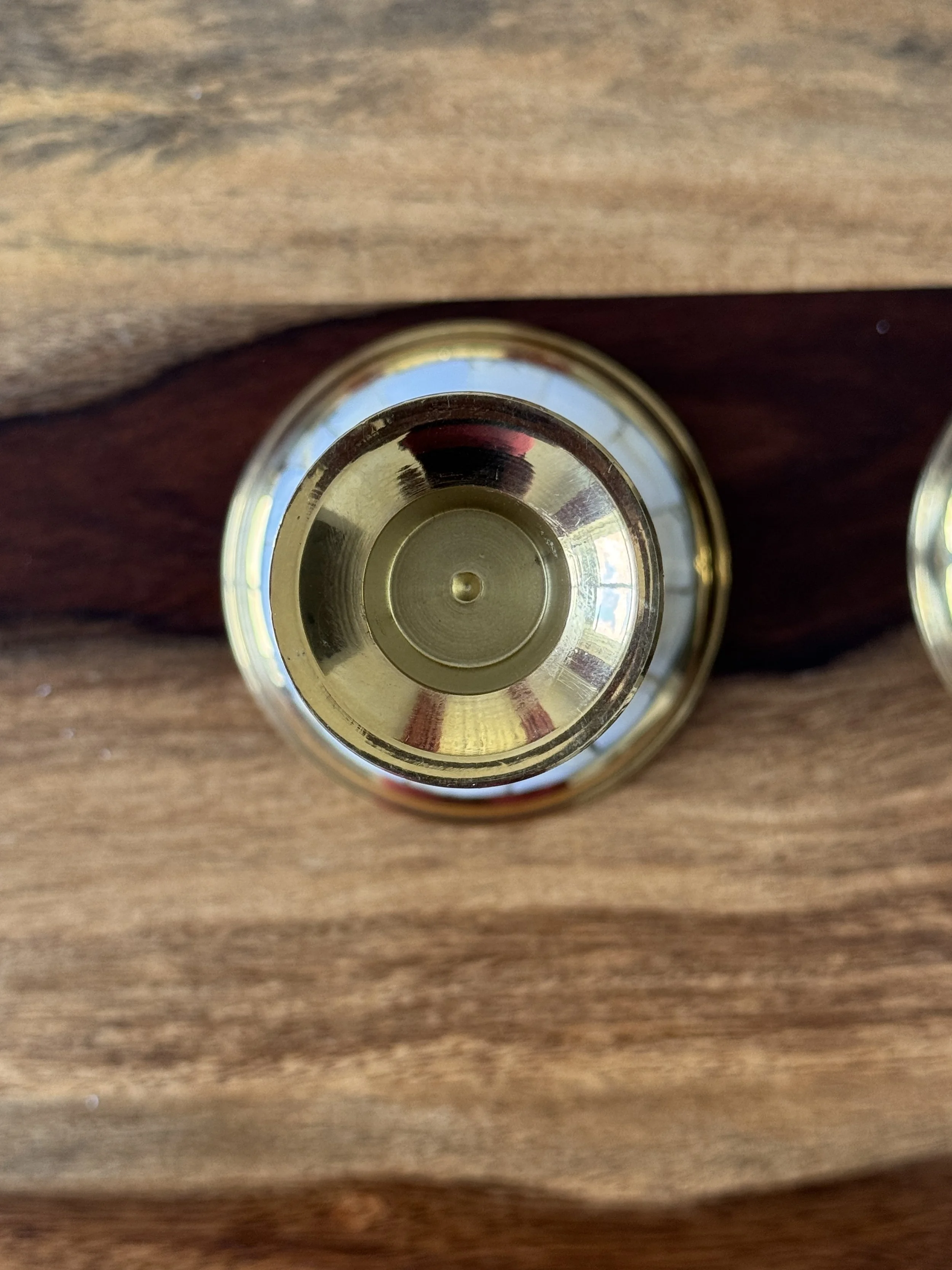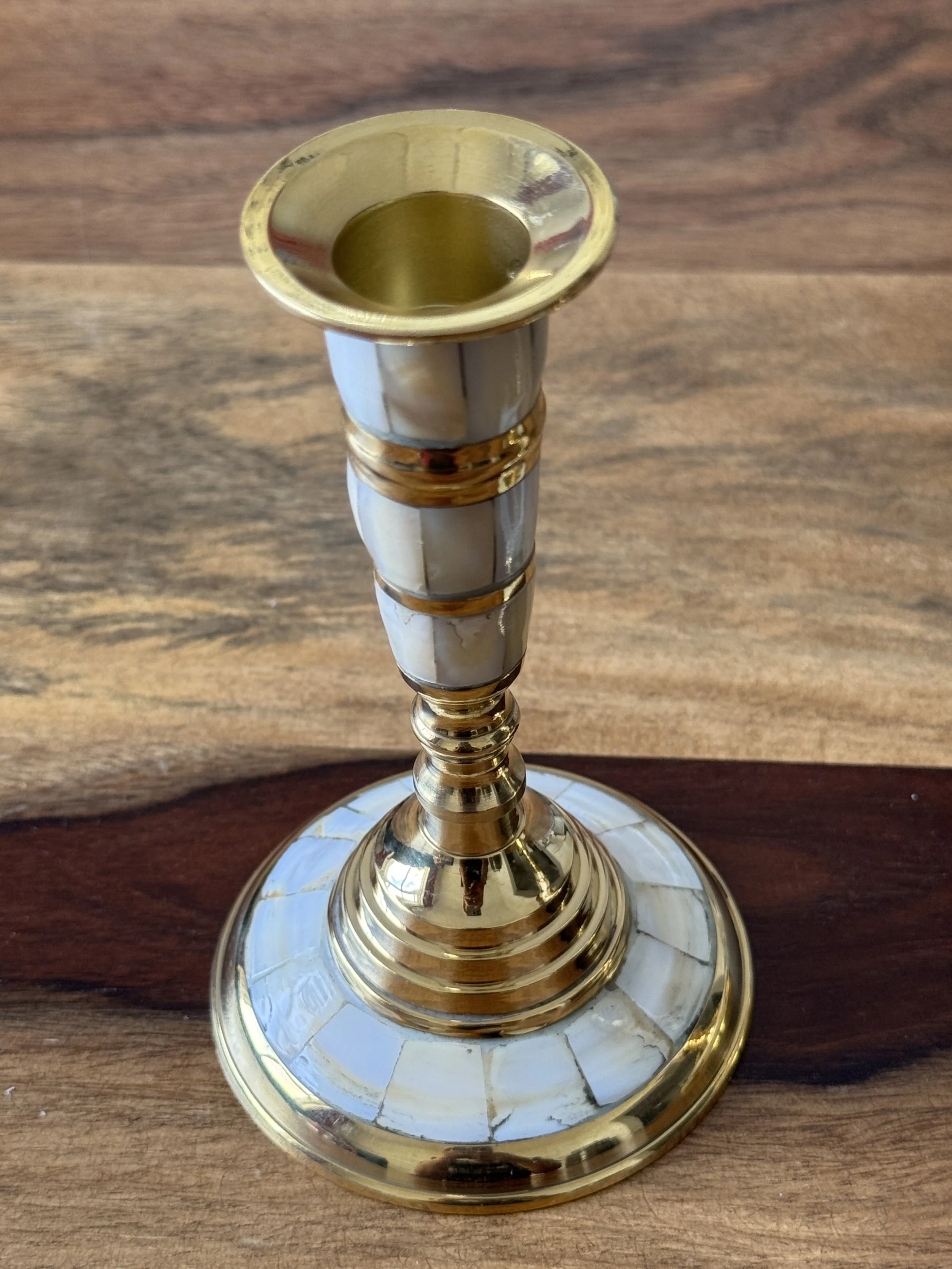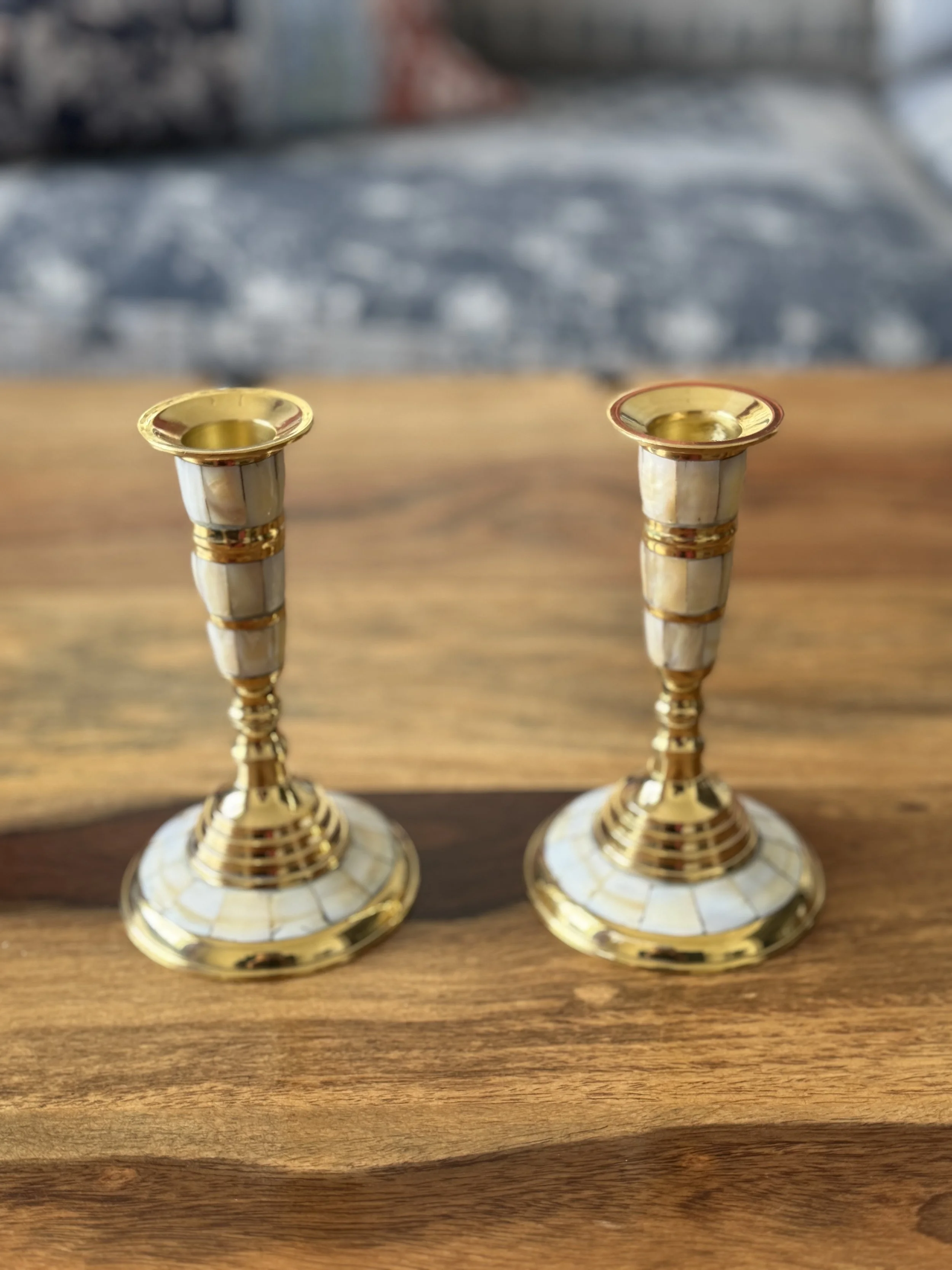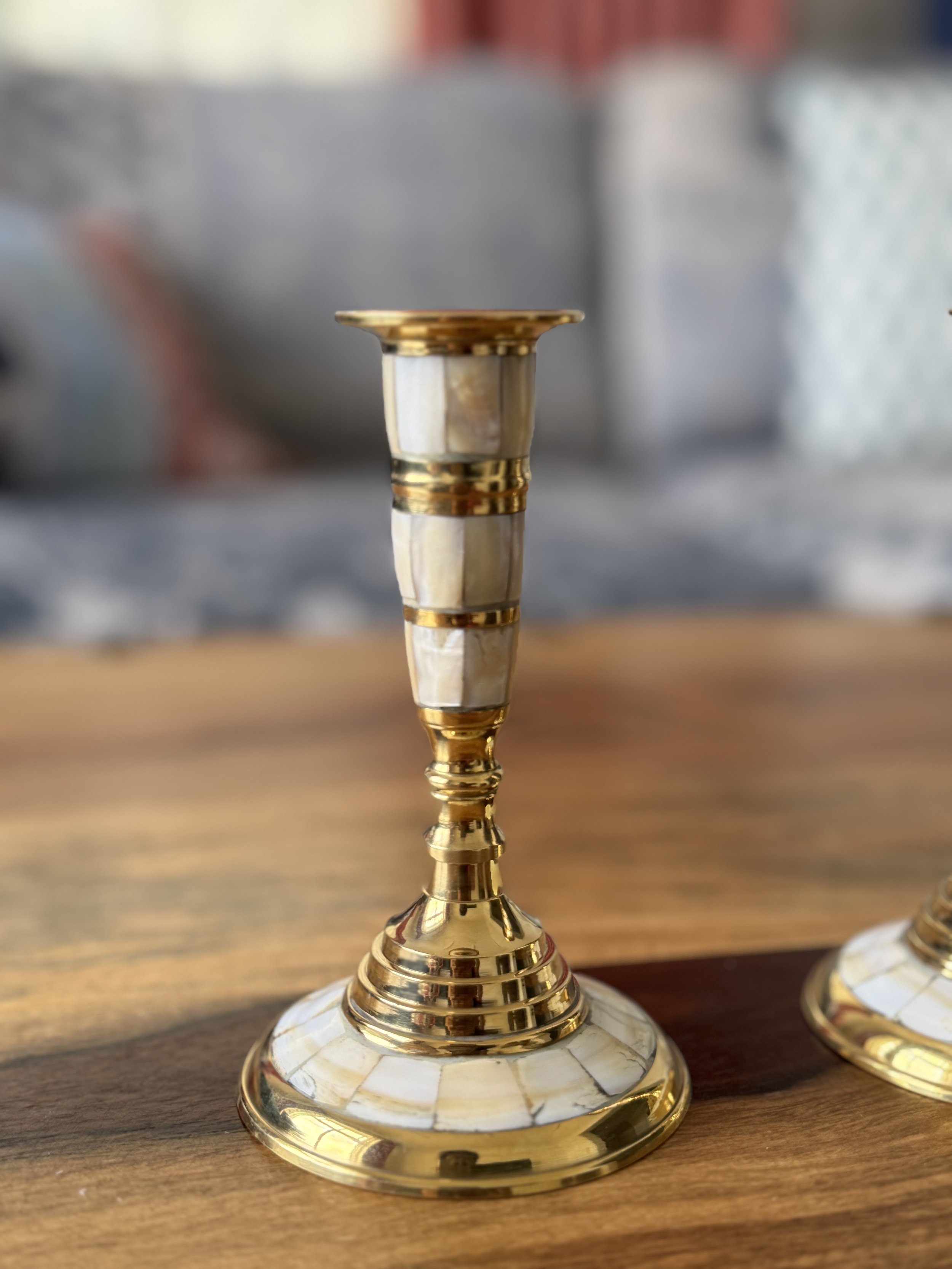 Crafted in durable brass and adorned with mother-of-pearl inlay, the candlestick holders are ideal for tapered candles.