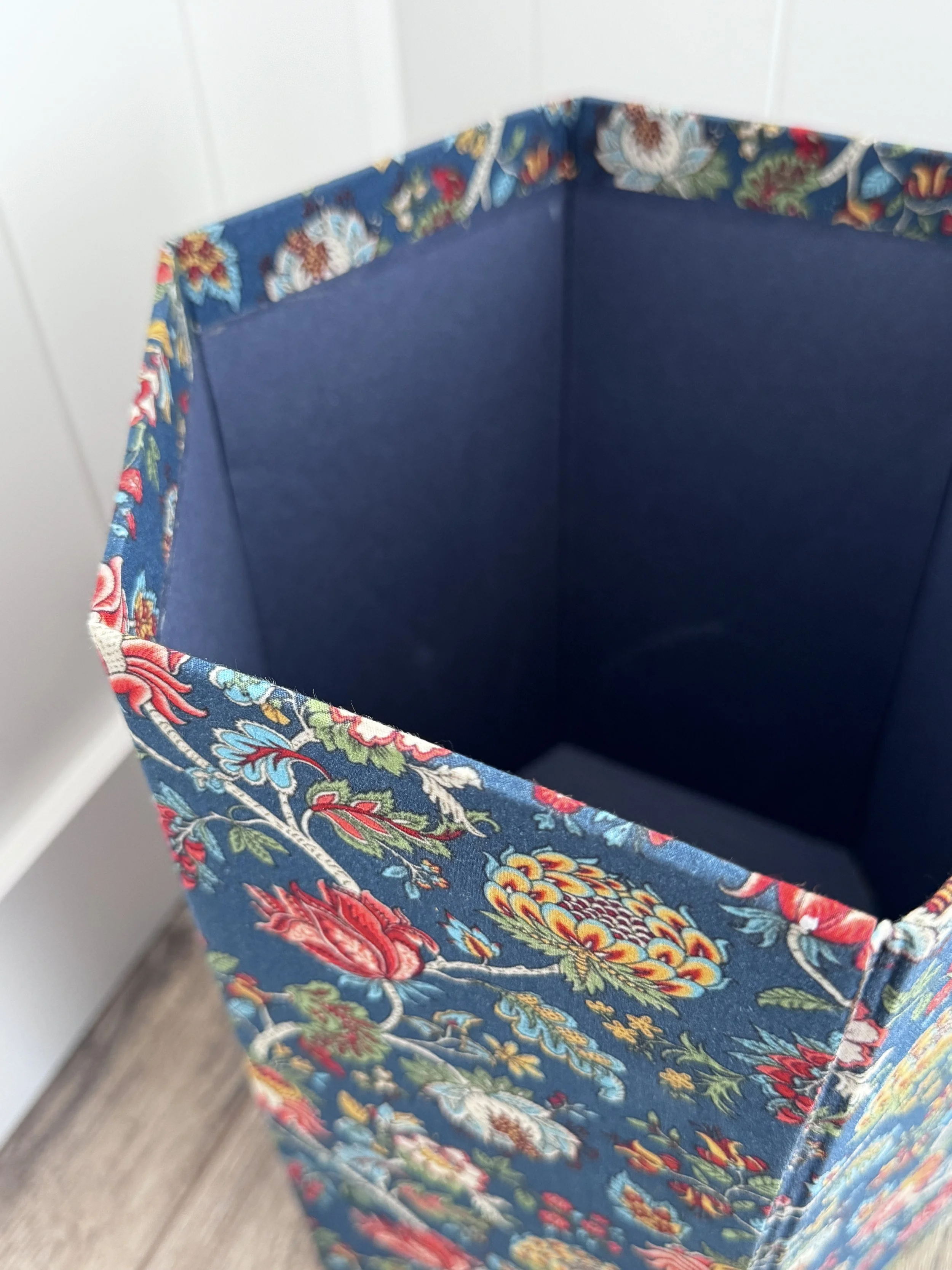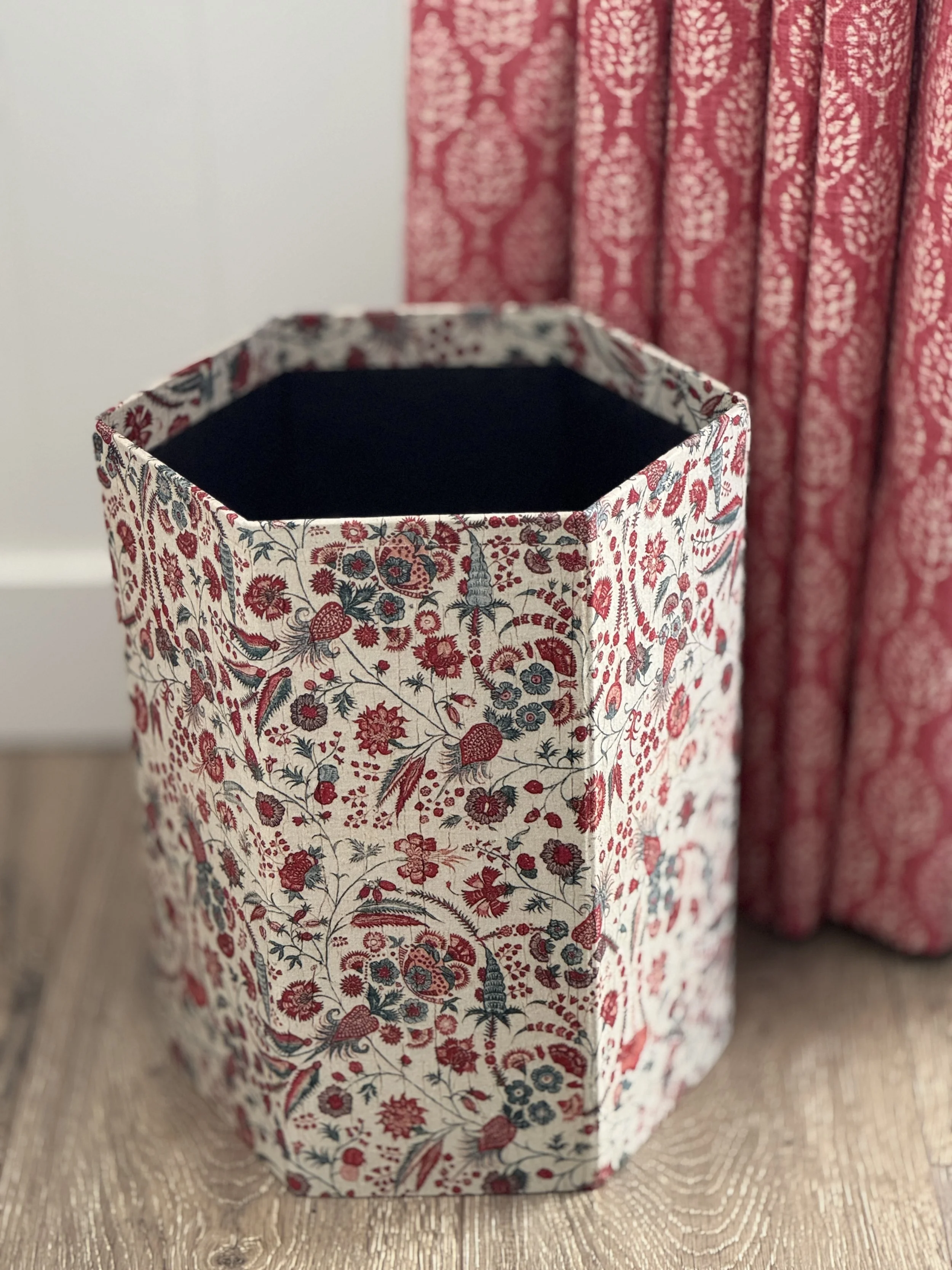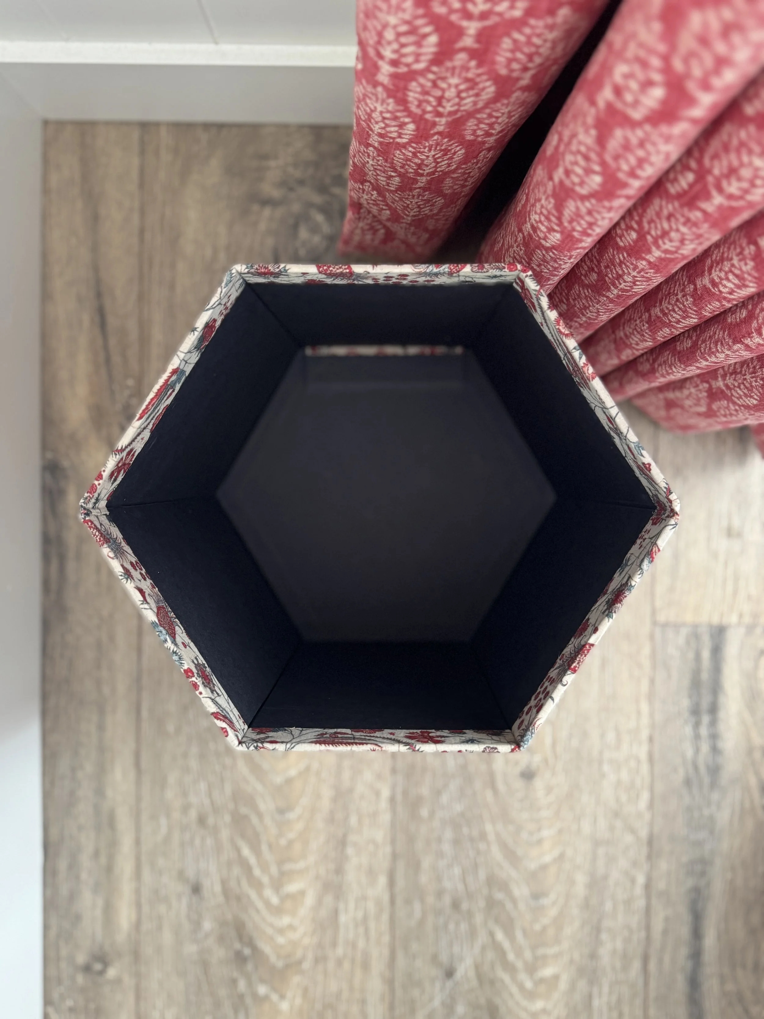 Hexagonal shaped (six-sided) neatly embellished with floral cotton prints. when not needed, it can be folded and tucked away! can your bin do that?