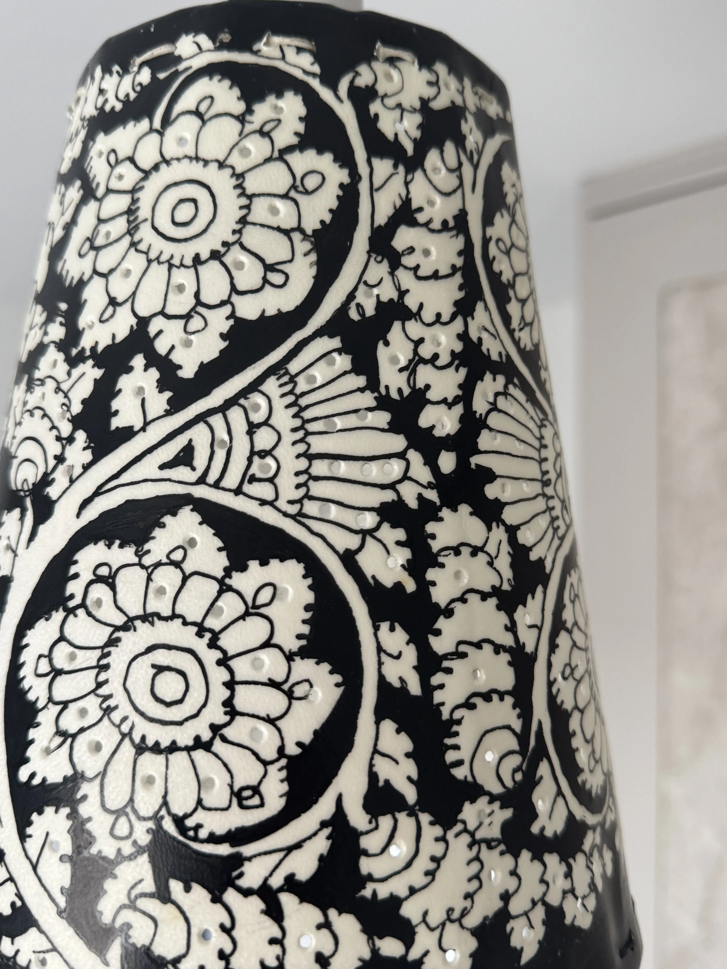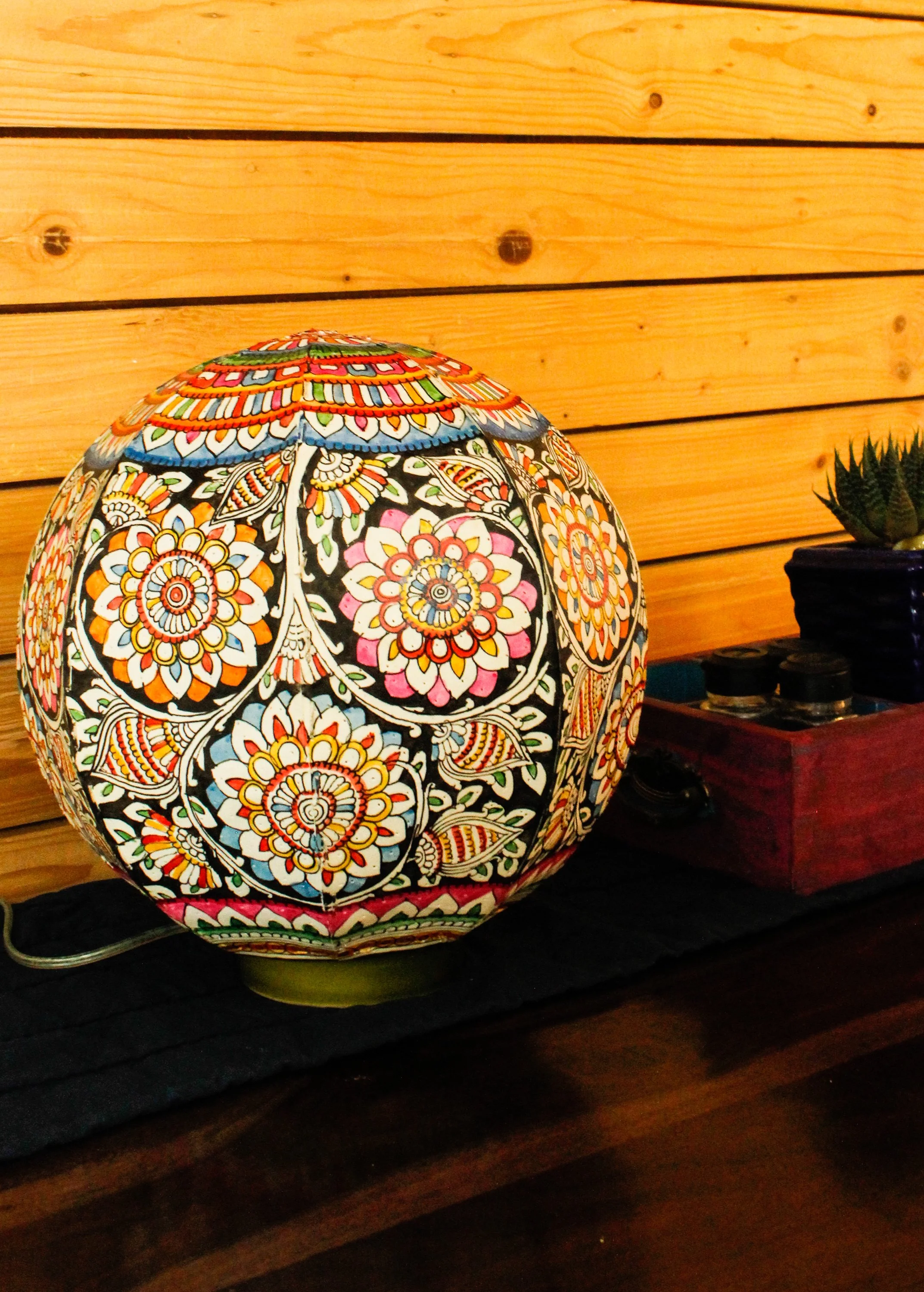 Crafted from authentic parchment leather, this exquisite handpainted lampshade features vibrant hues and patterns brought to life by skilled craftspersons in India. Celebrate heritage and color inspired by the traditional art of Tholu Bommalata.