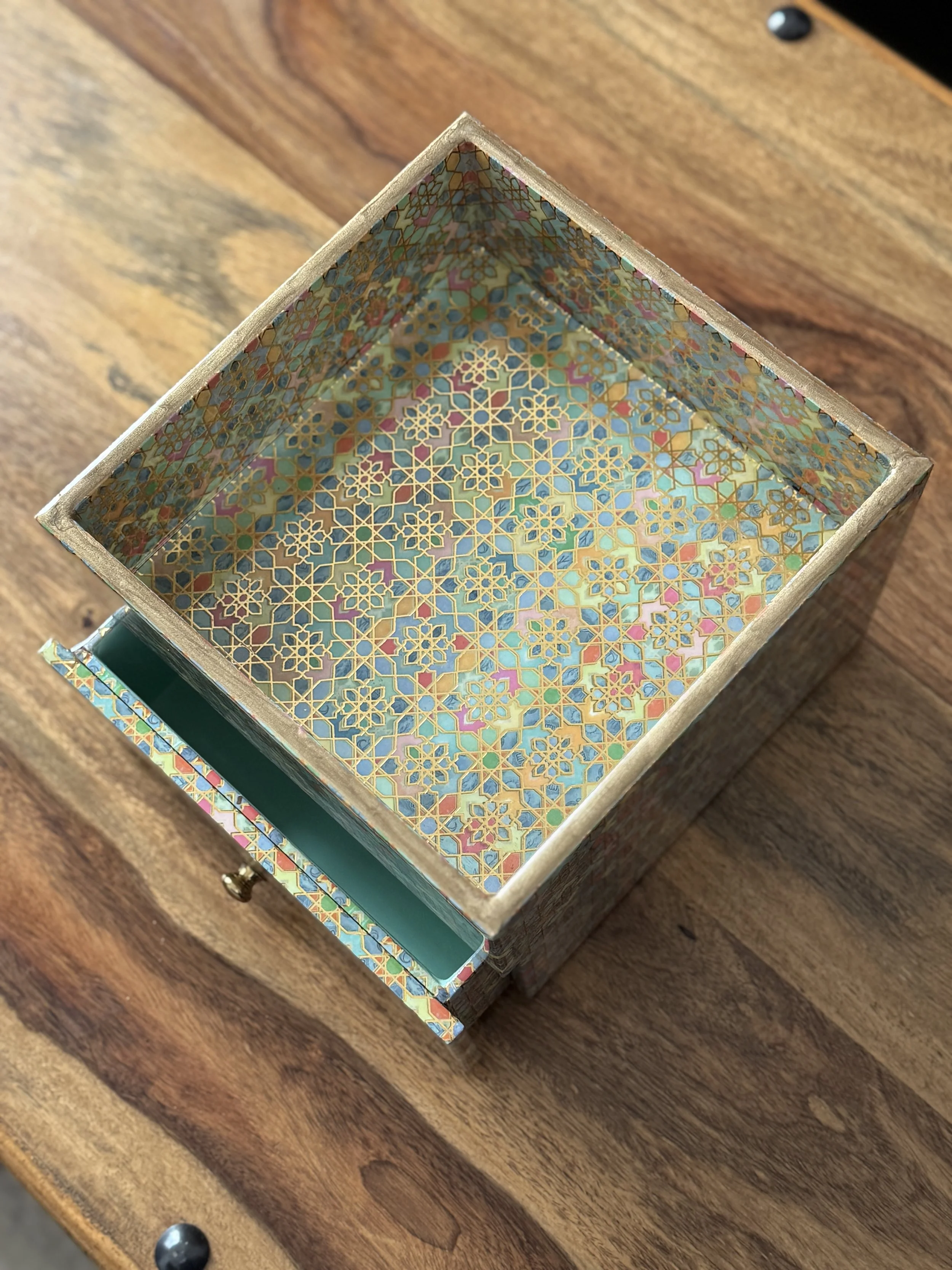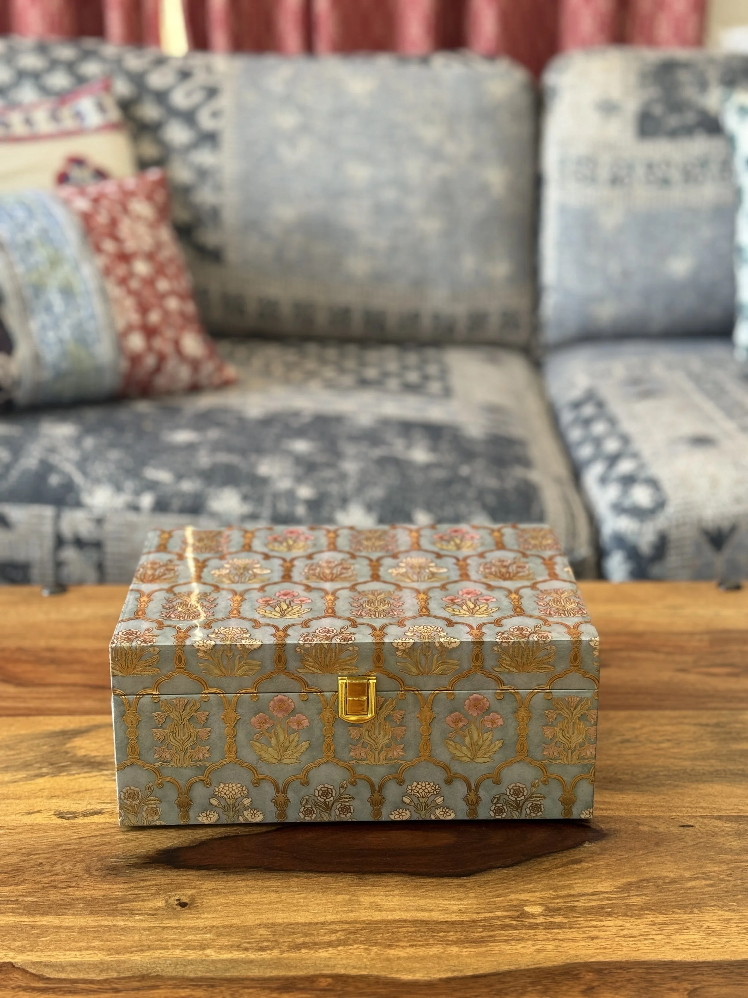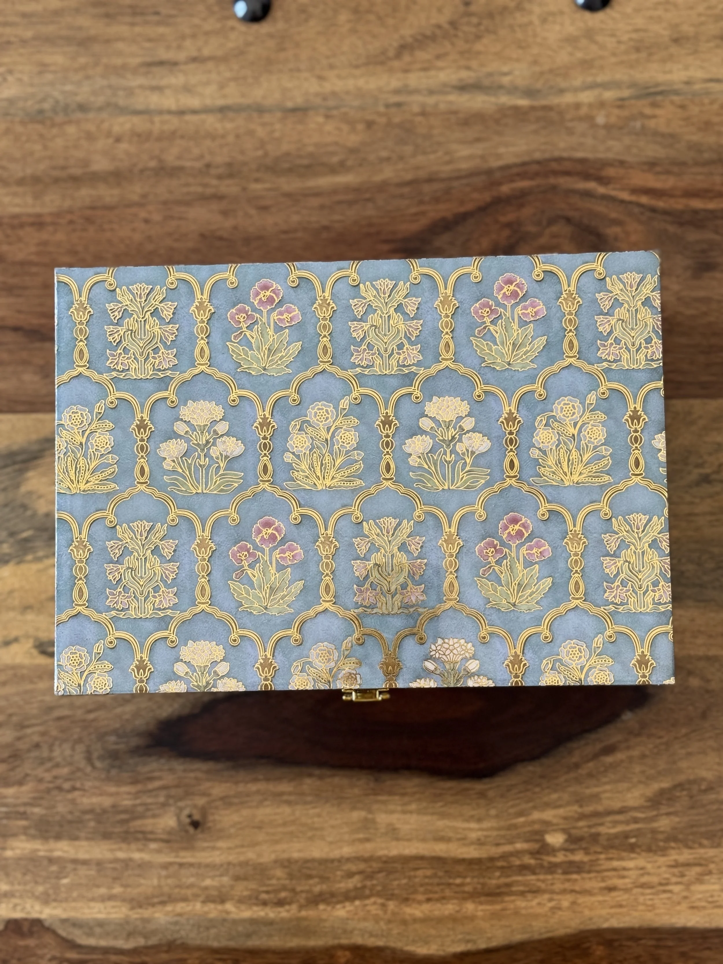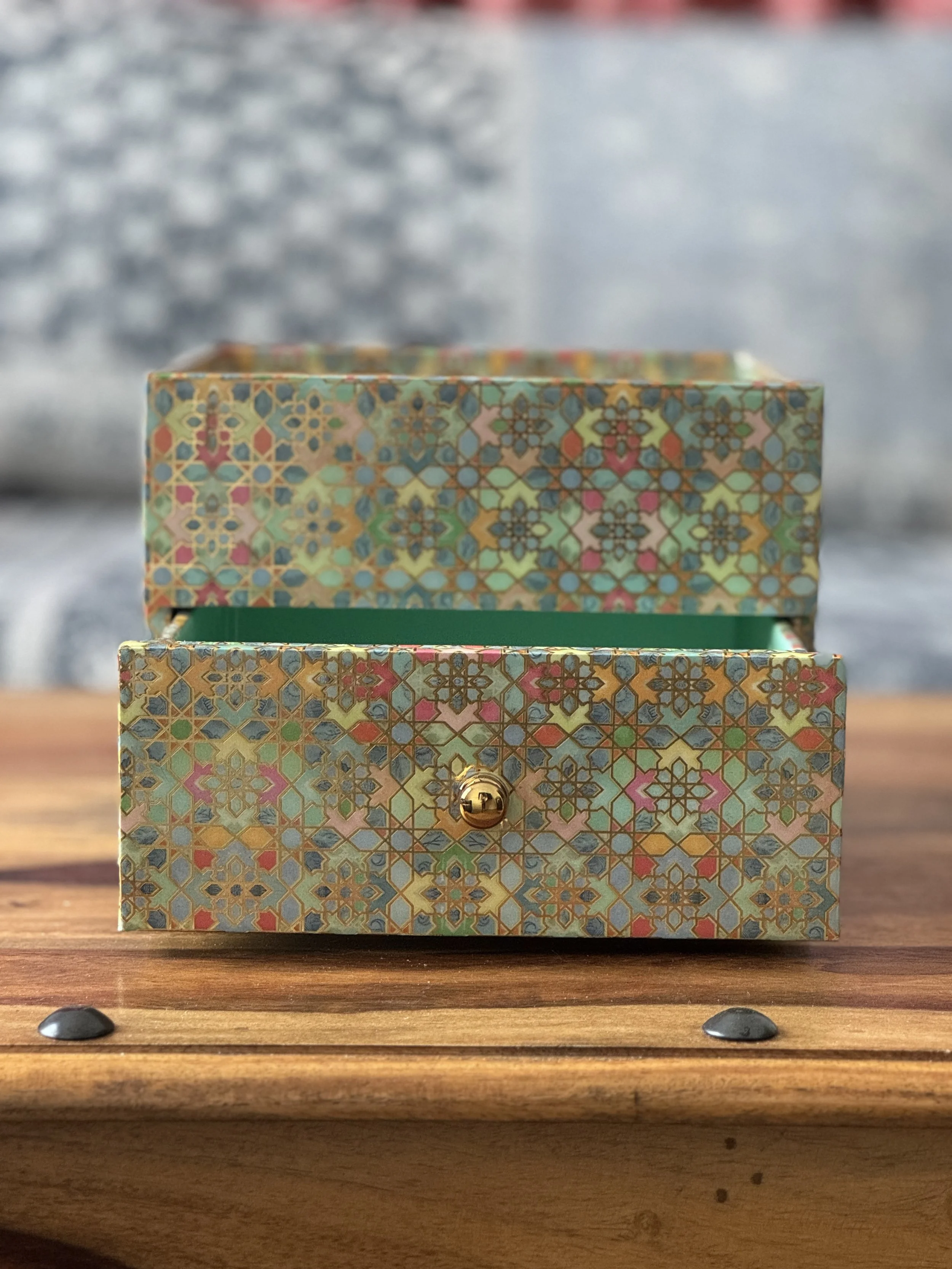 The print features arch motifs with flowers from palaces in Jaipur, which have graced Rajasthan’s streets for centuries now. Elevate your desk organization with this single drawer organizer with a tray top, featuring gold tone knobs.