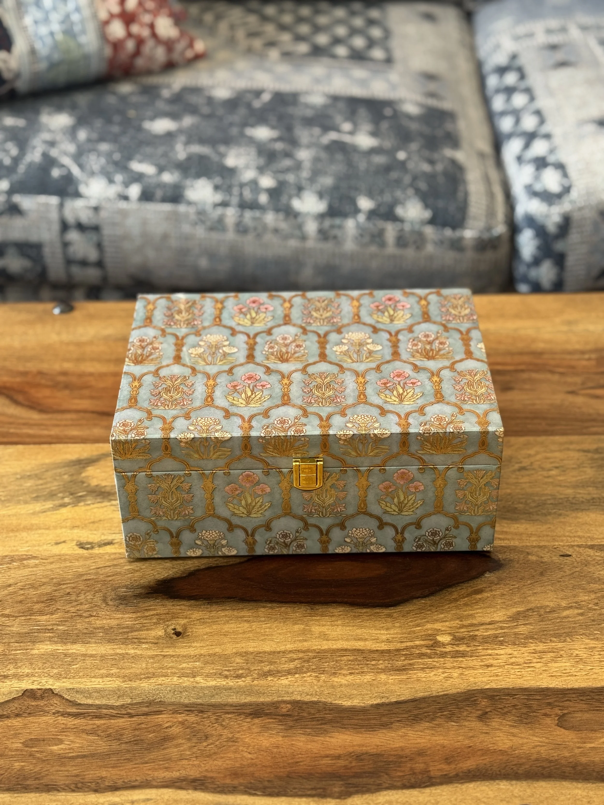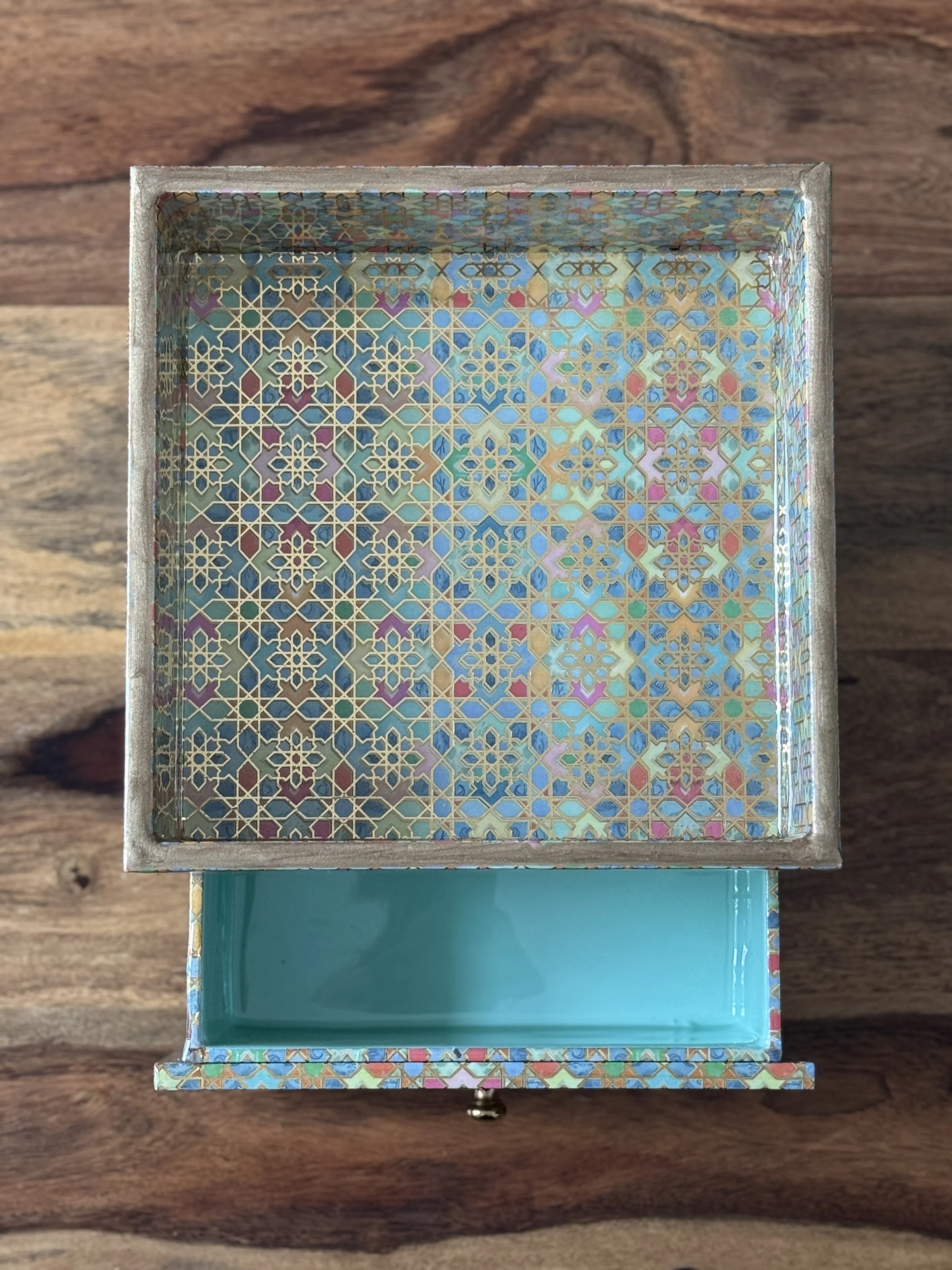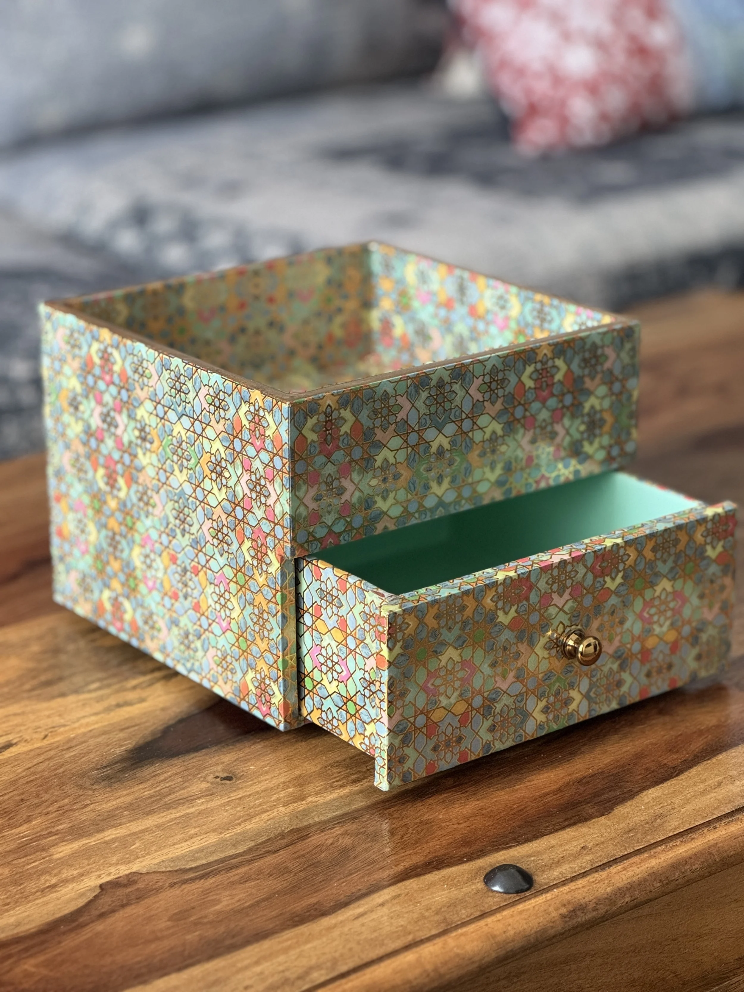 The print features arch motifs with flowers from palaces in Jaipur, which have graced Rajasthan’s streets for centuries now. Elevate your desk organization with this single drawer organizer with a tray top, featuring gold tone knobs.