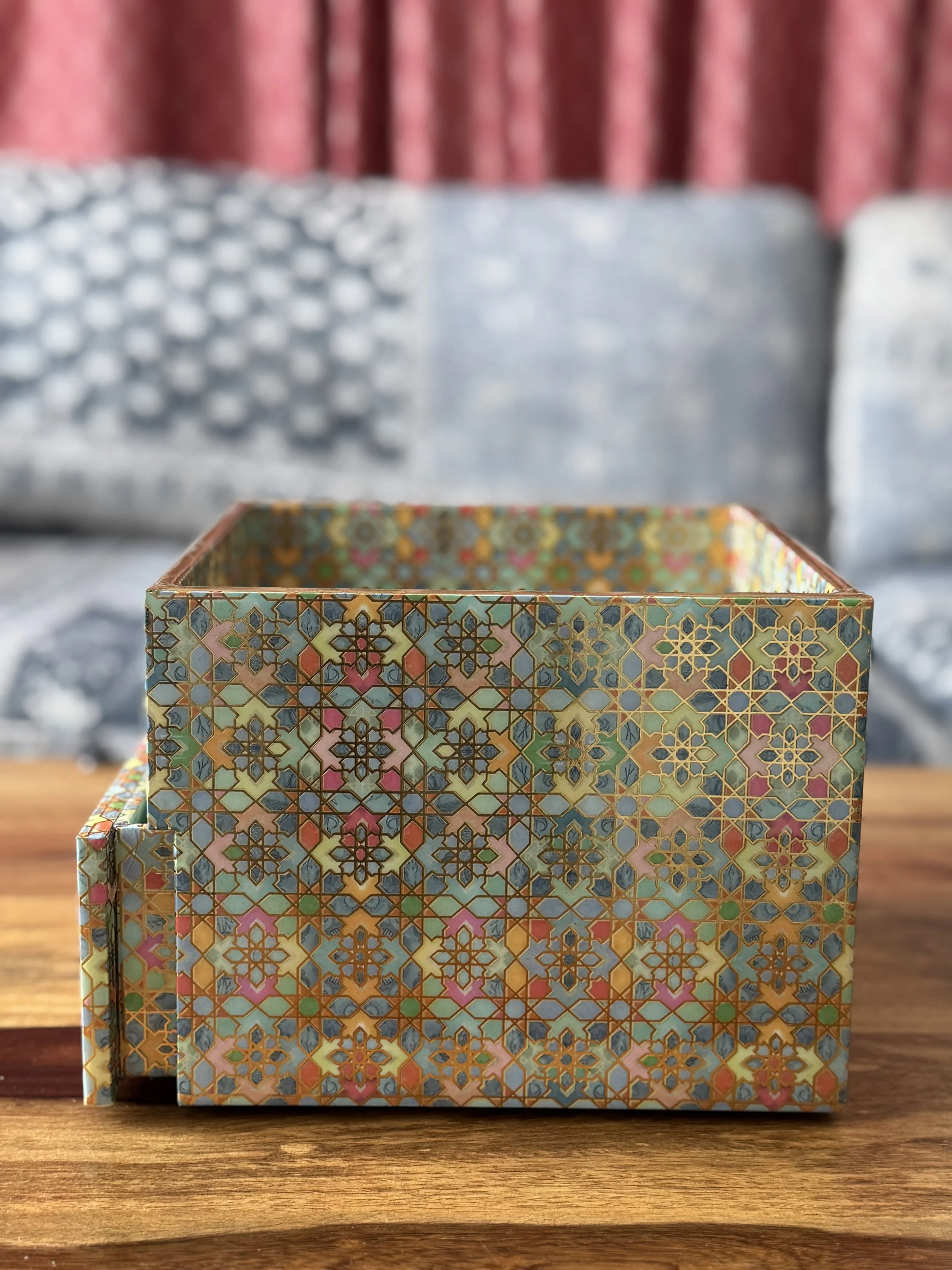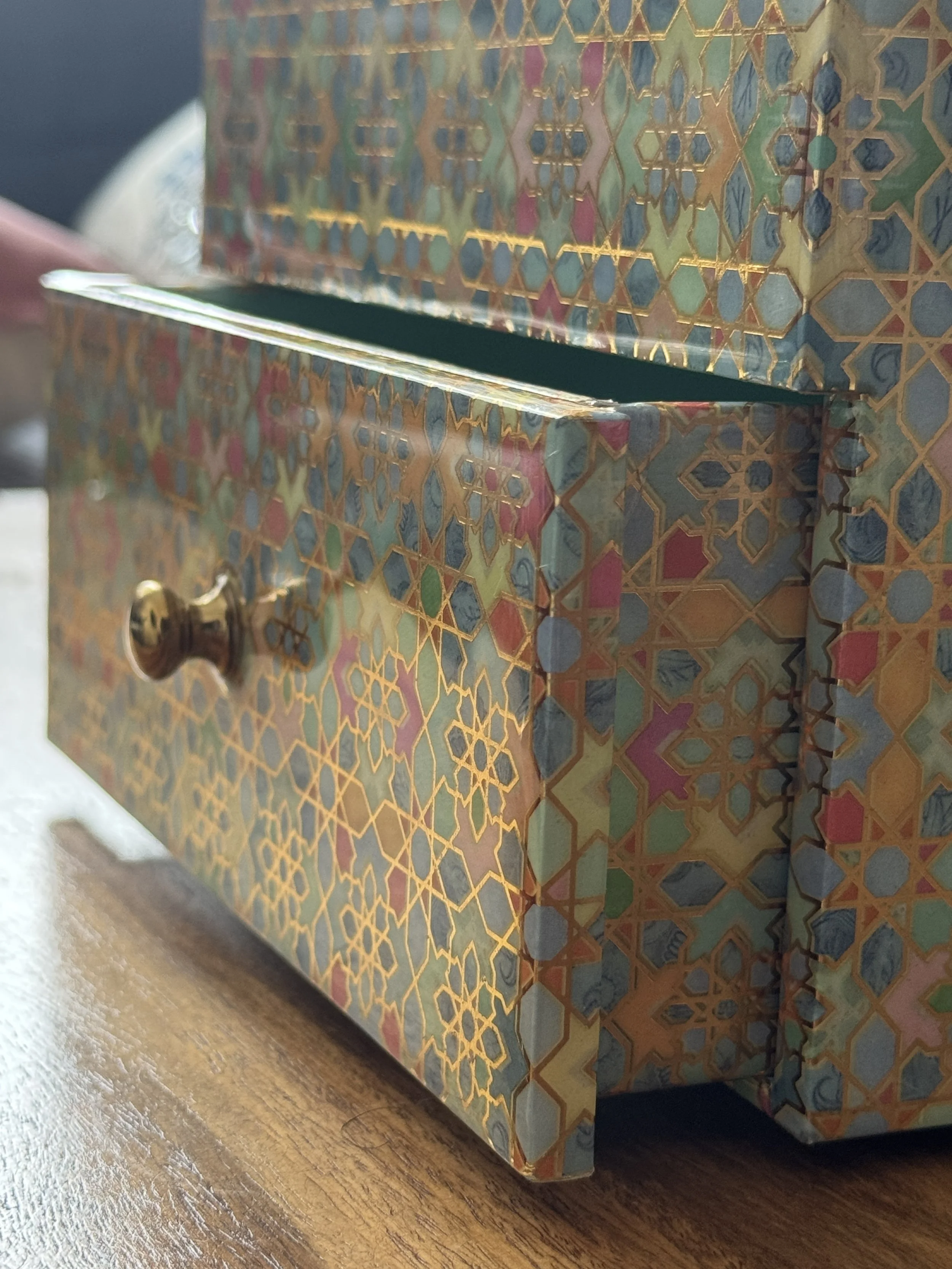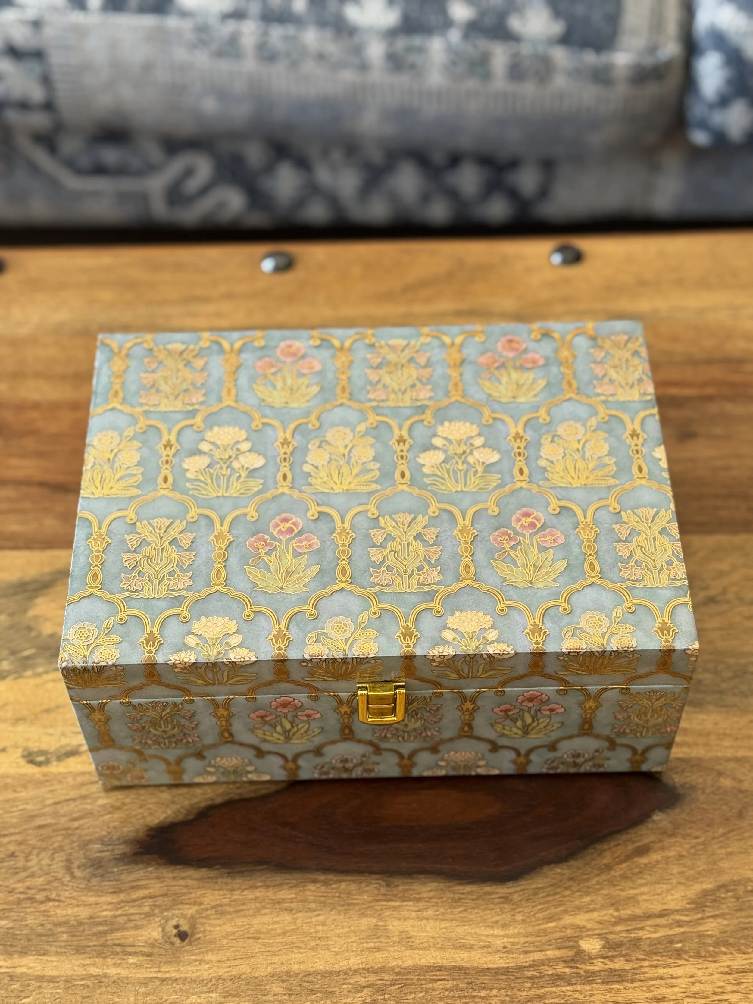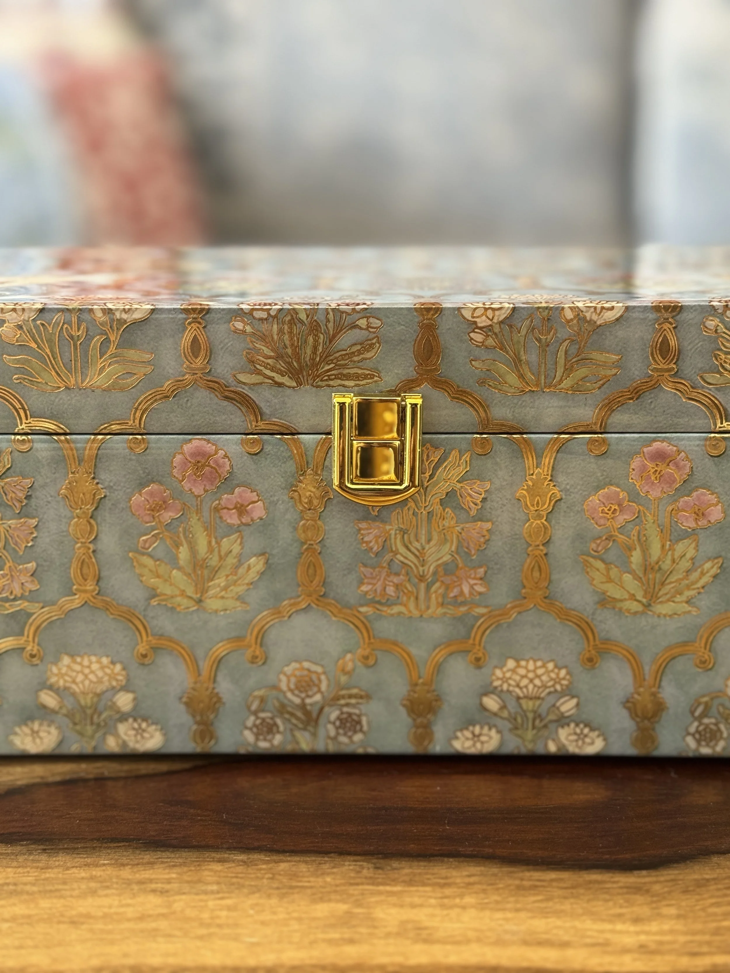 The print features arch motifs with flowers from palaces in Jaipur, which have graced Rajasthan’s streets for centuries now. Elevate your desk organization with this single drawer organizer with a tray top, featuring gold tone knobs.