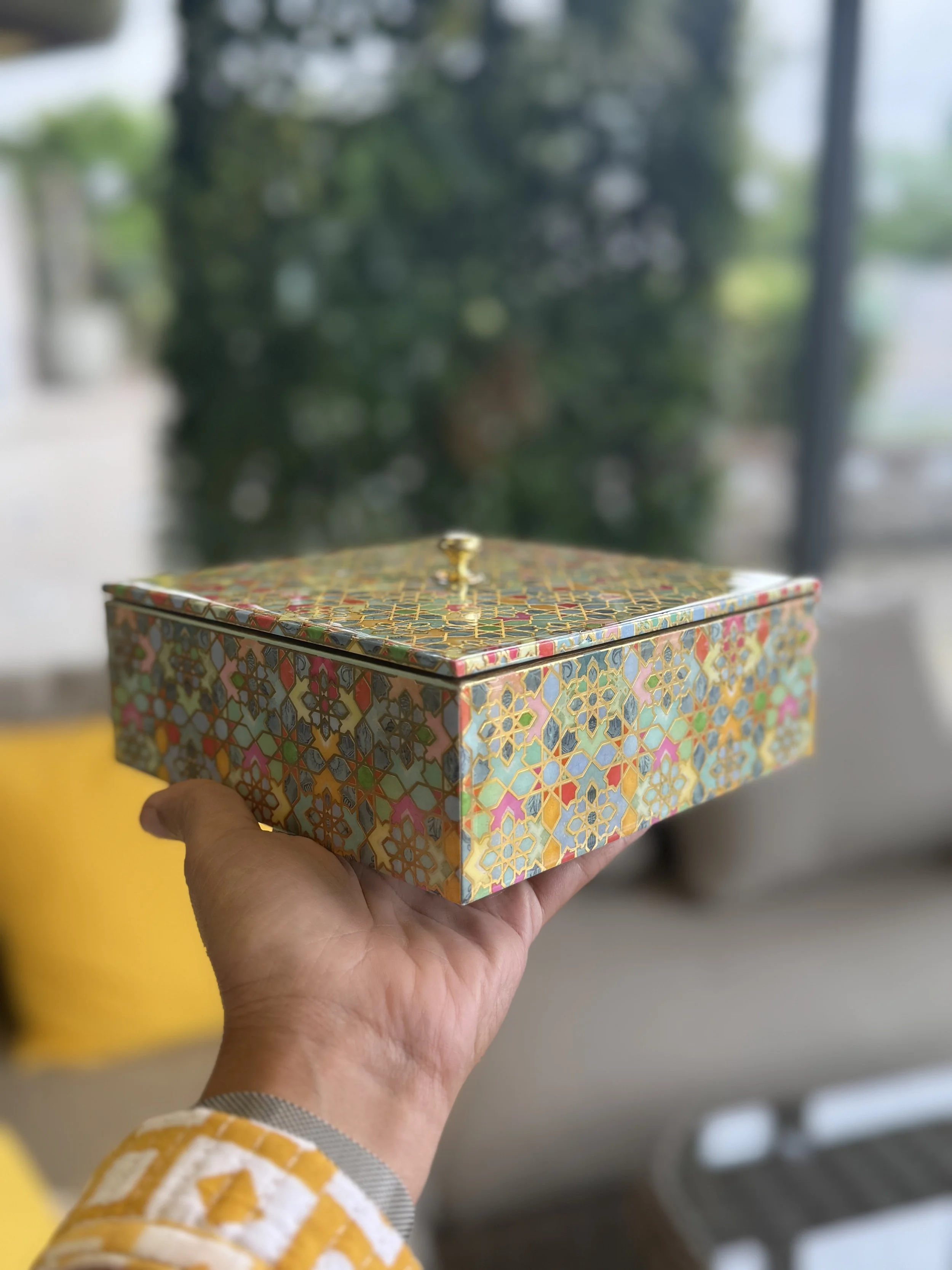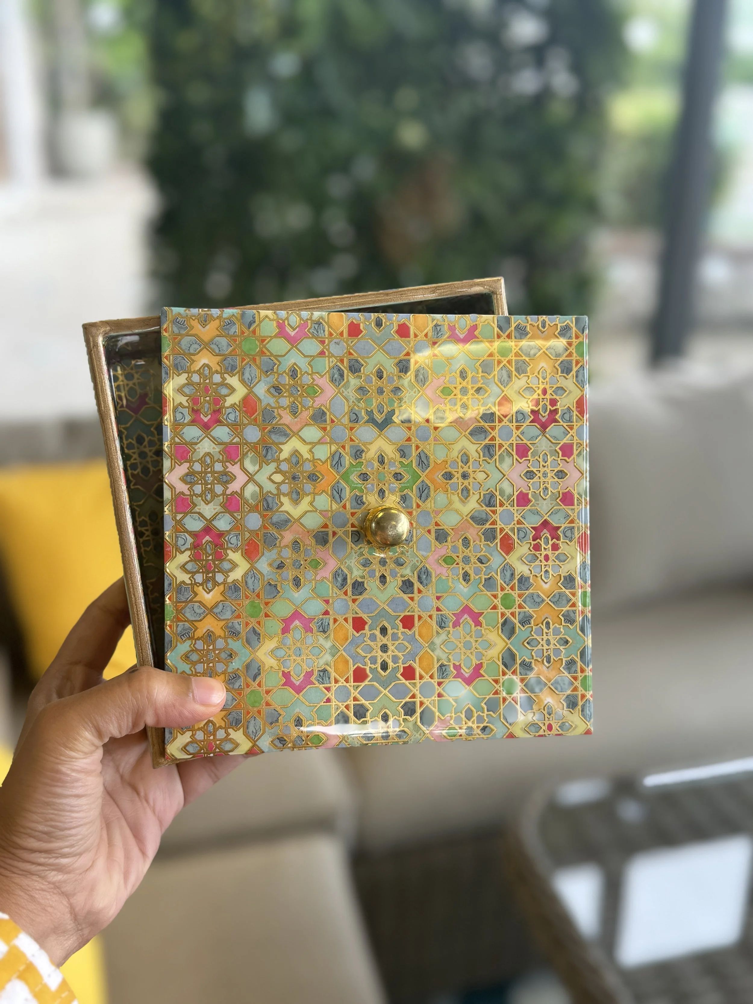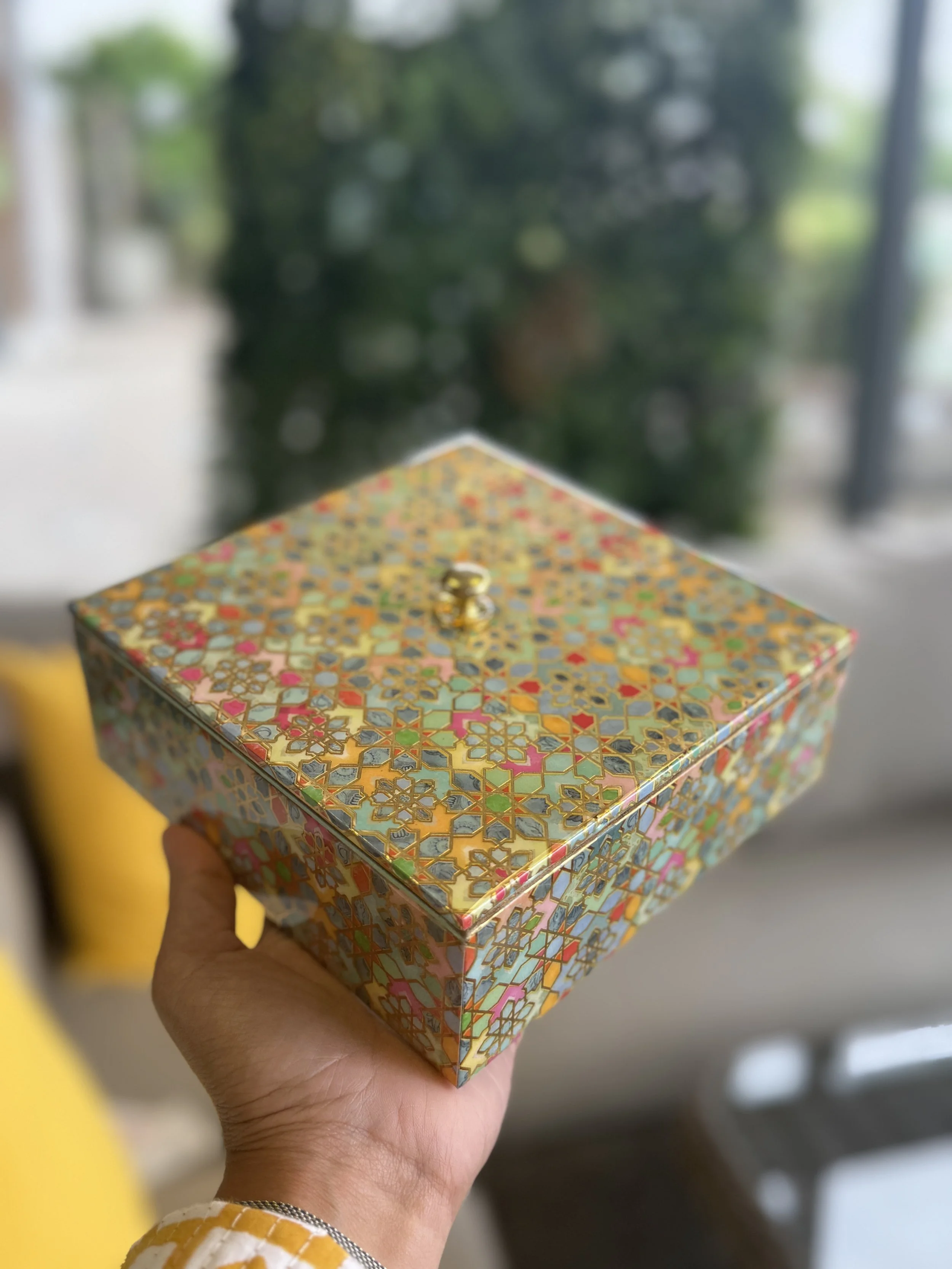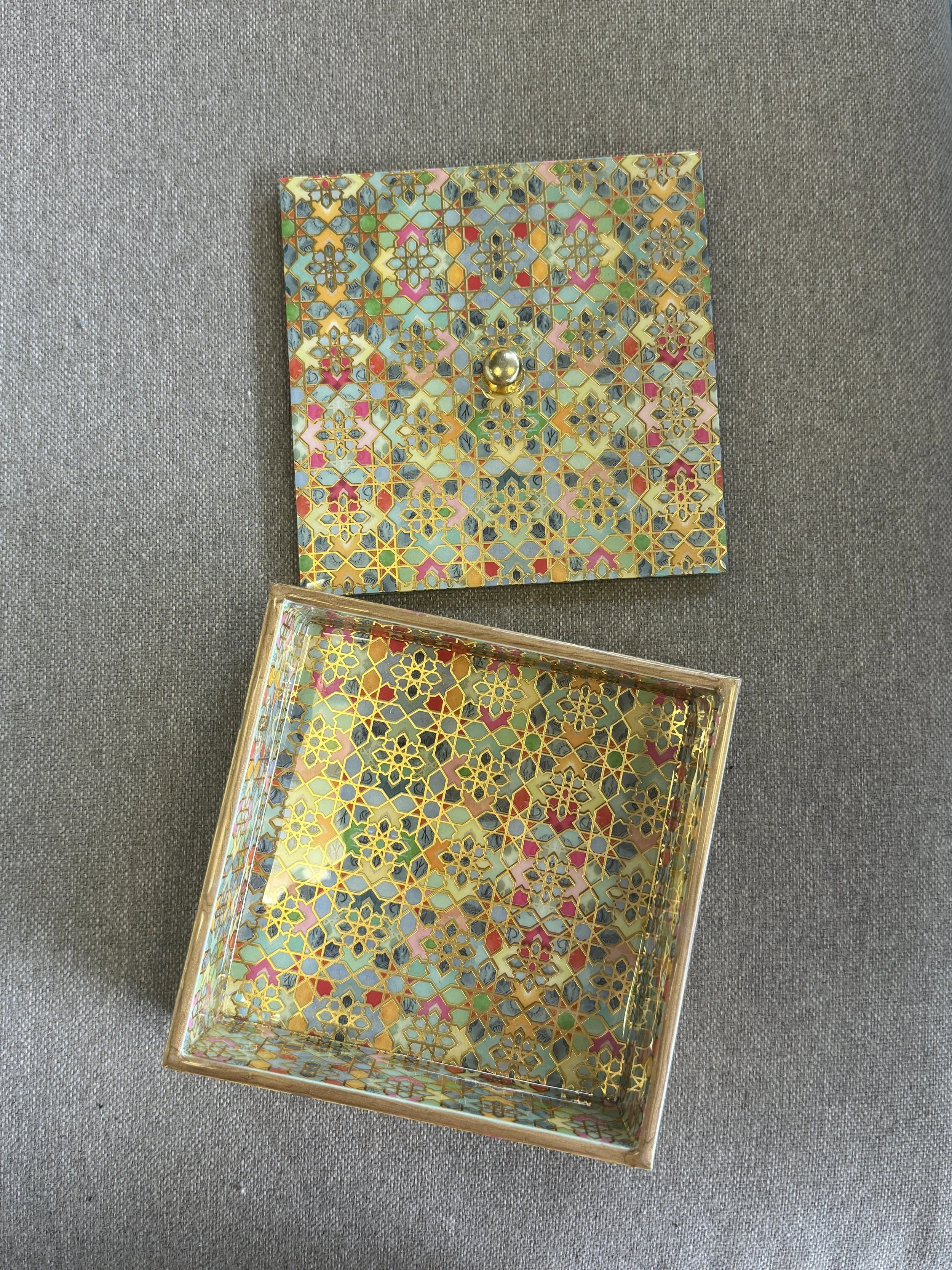 Cotton Bud / everyday jewellery or watches storage box. The high definition print features gold outline on the floral motifs that glow with a ray of sunshine as seen in photos.