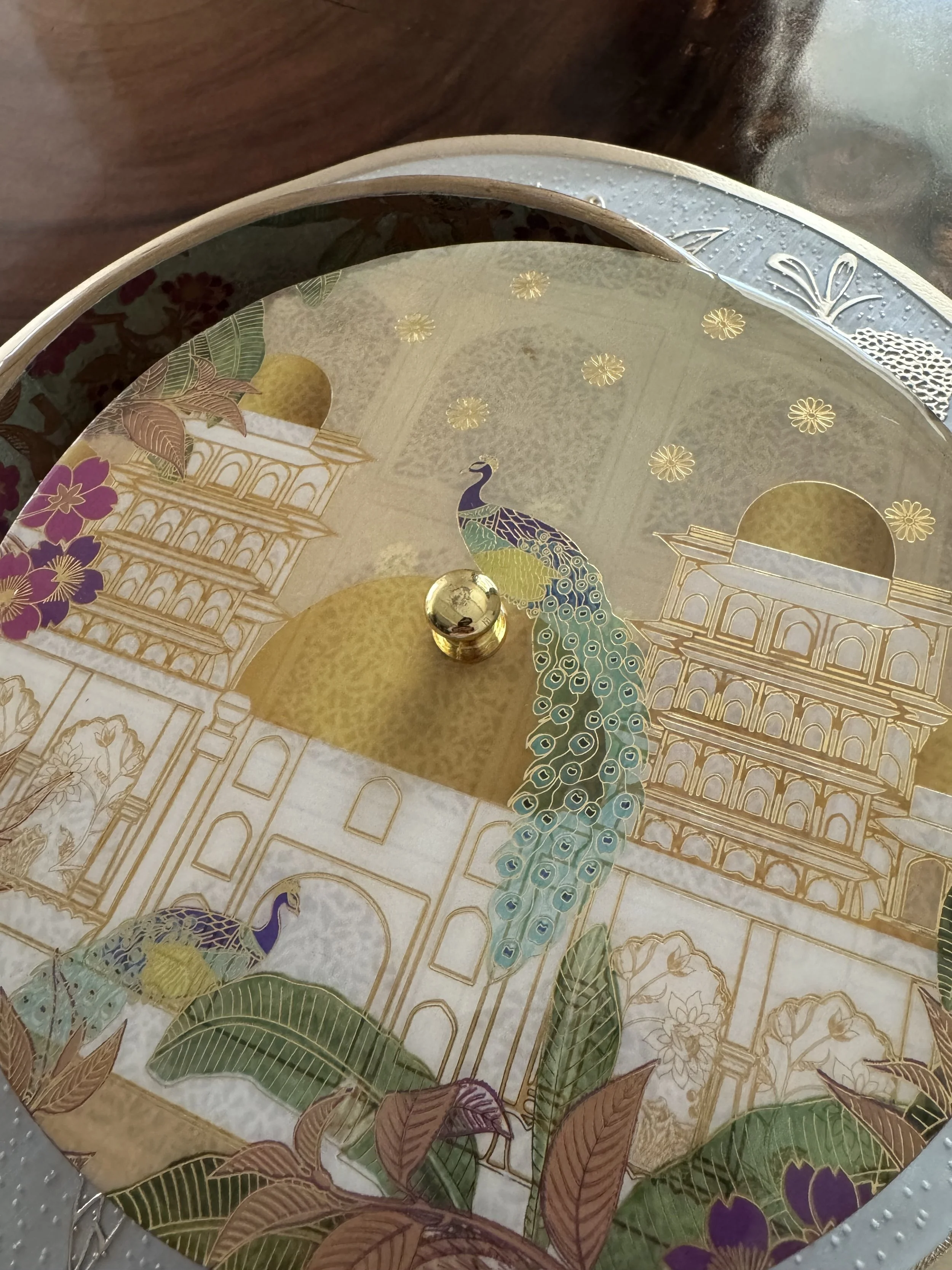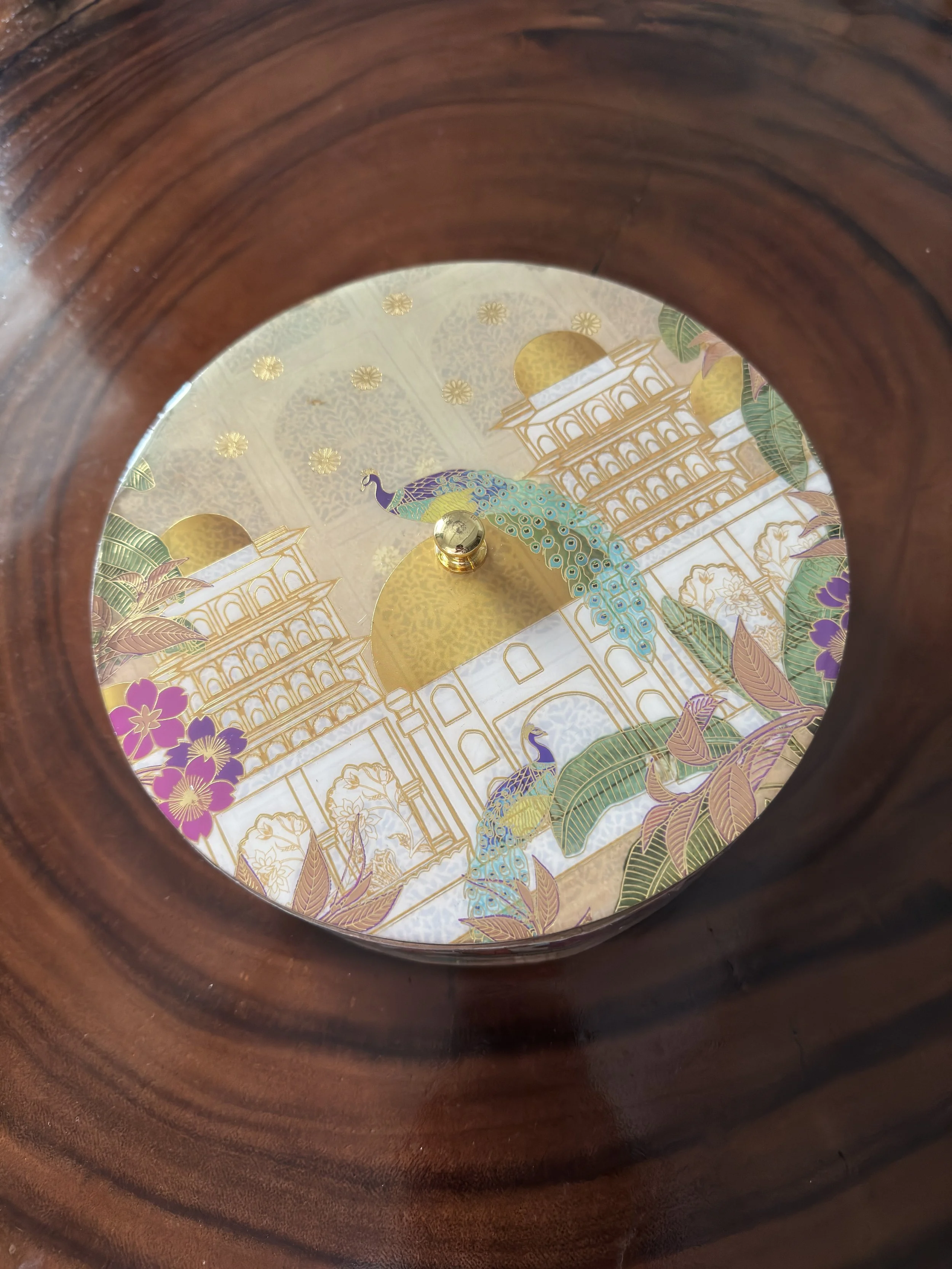 Cotton Bud / everyday jewellery or watches storage box. The high definition print features gold outline on the floral motifs that glow with a ray of sunshine as seen in photos.