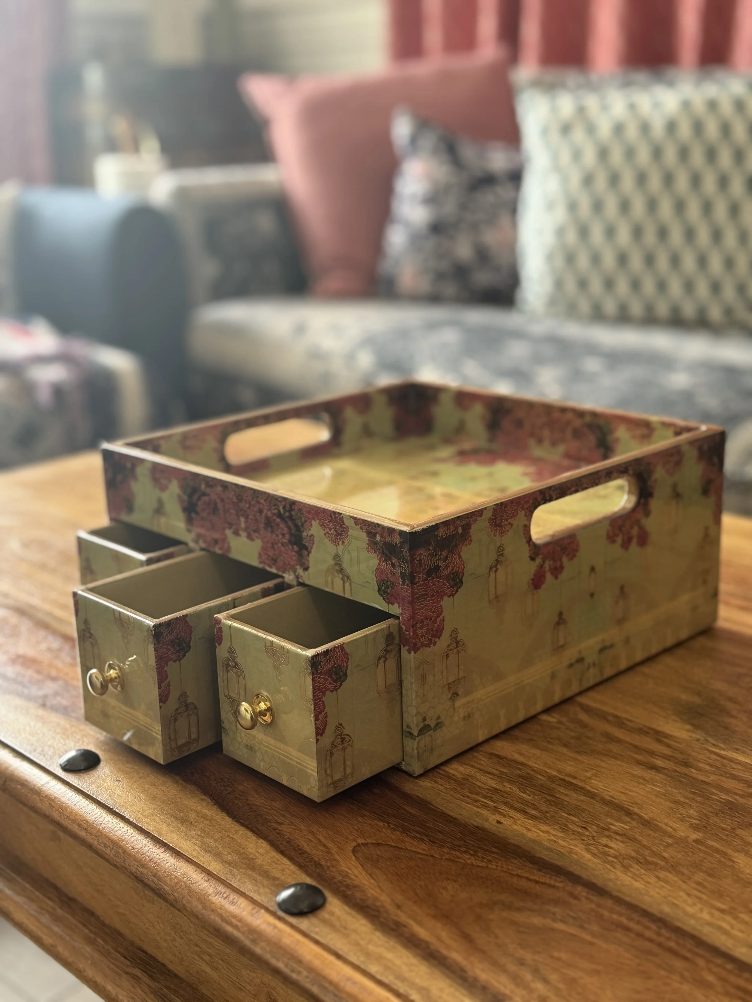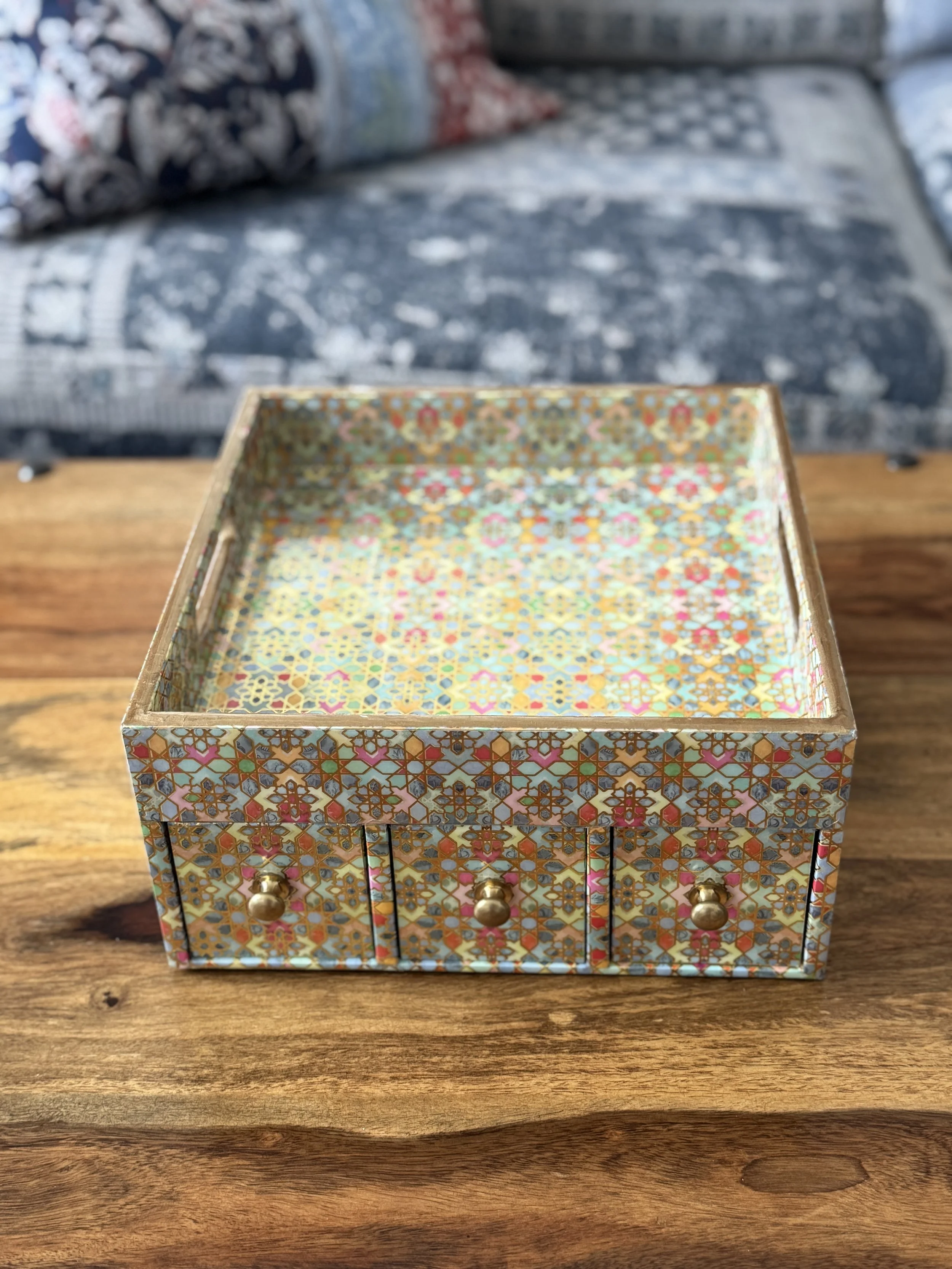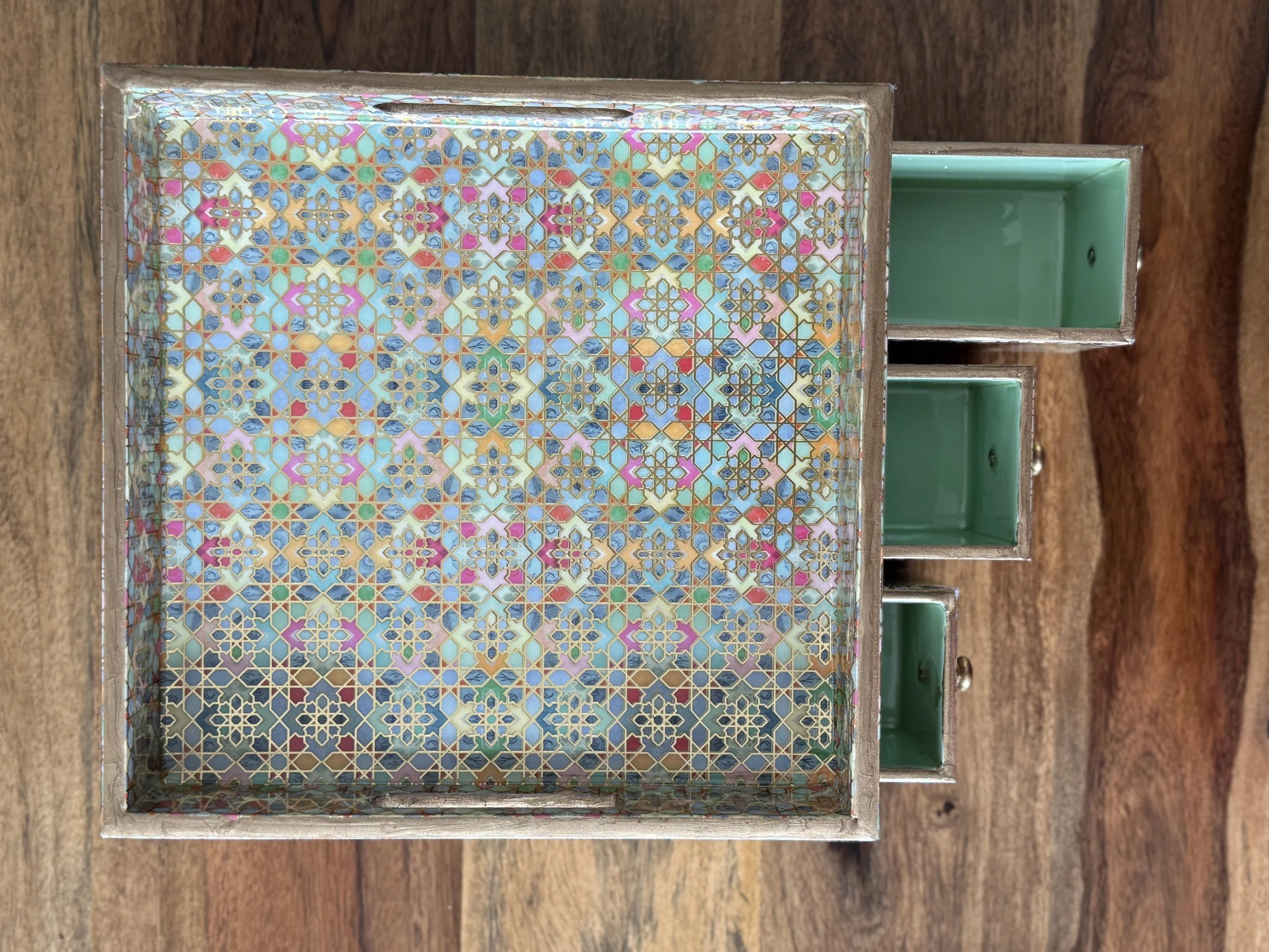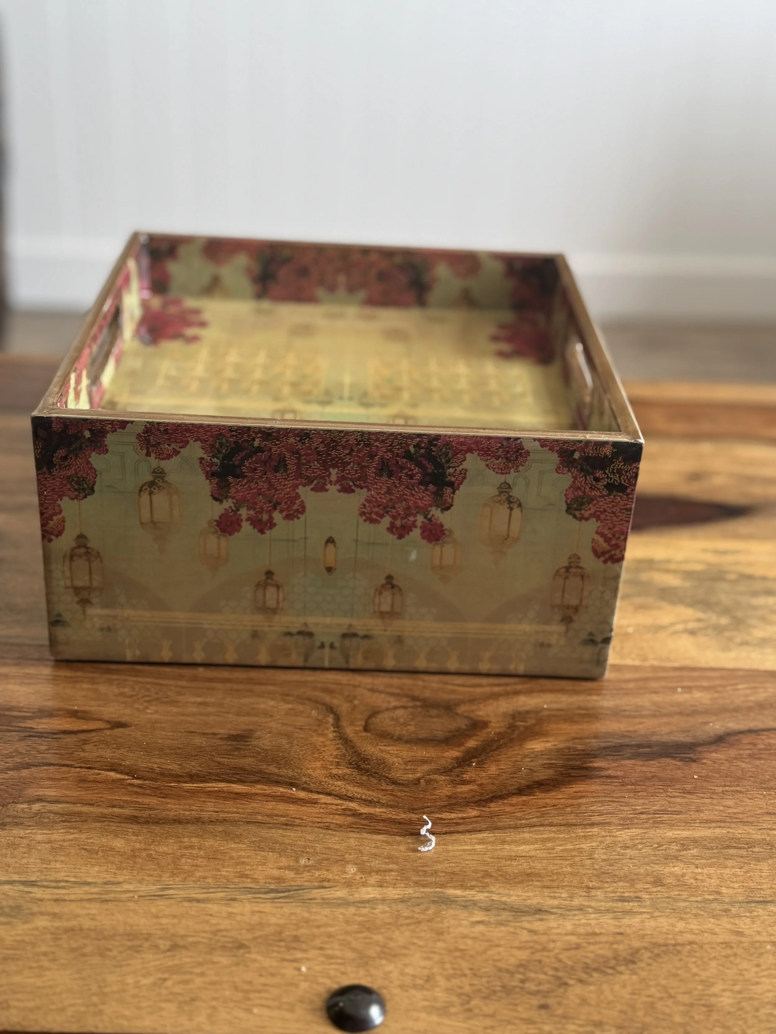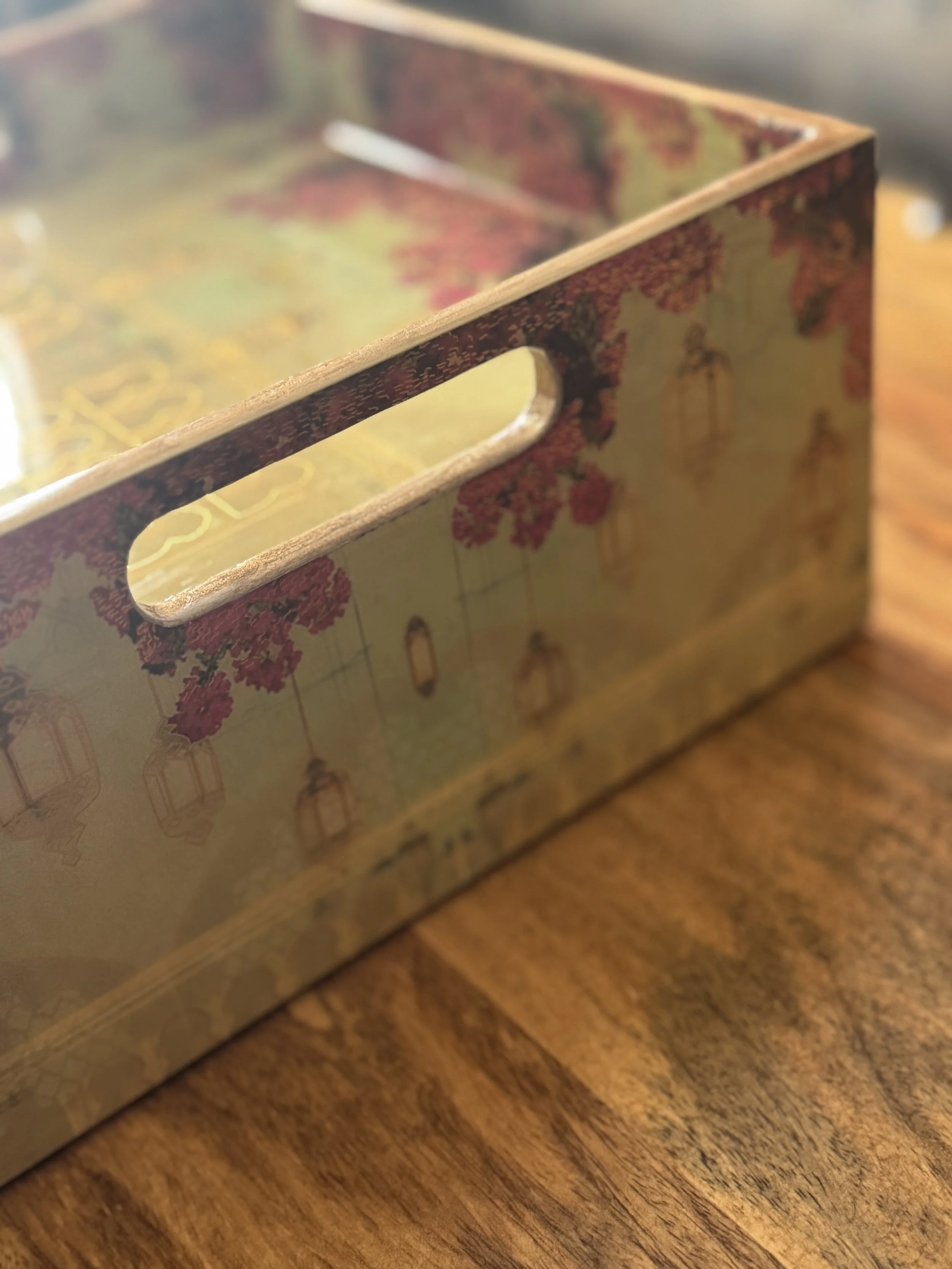 Elevate your snack game with our beautifully crafted mango wood platter, designed for effortless entertaining. Featuring a striking blue floral and bird motif, covered with enamel coating, this round platter comes with a built-in (detachable) central dip bowl, perfect for serving tortillas, chips, crackers, veggies — and of course, your favorite dips or salsas.