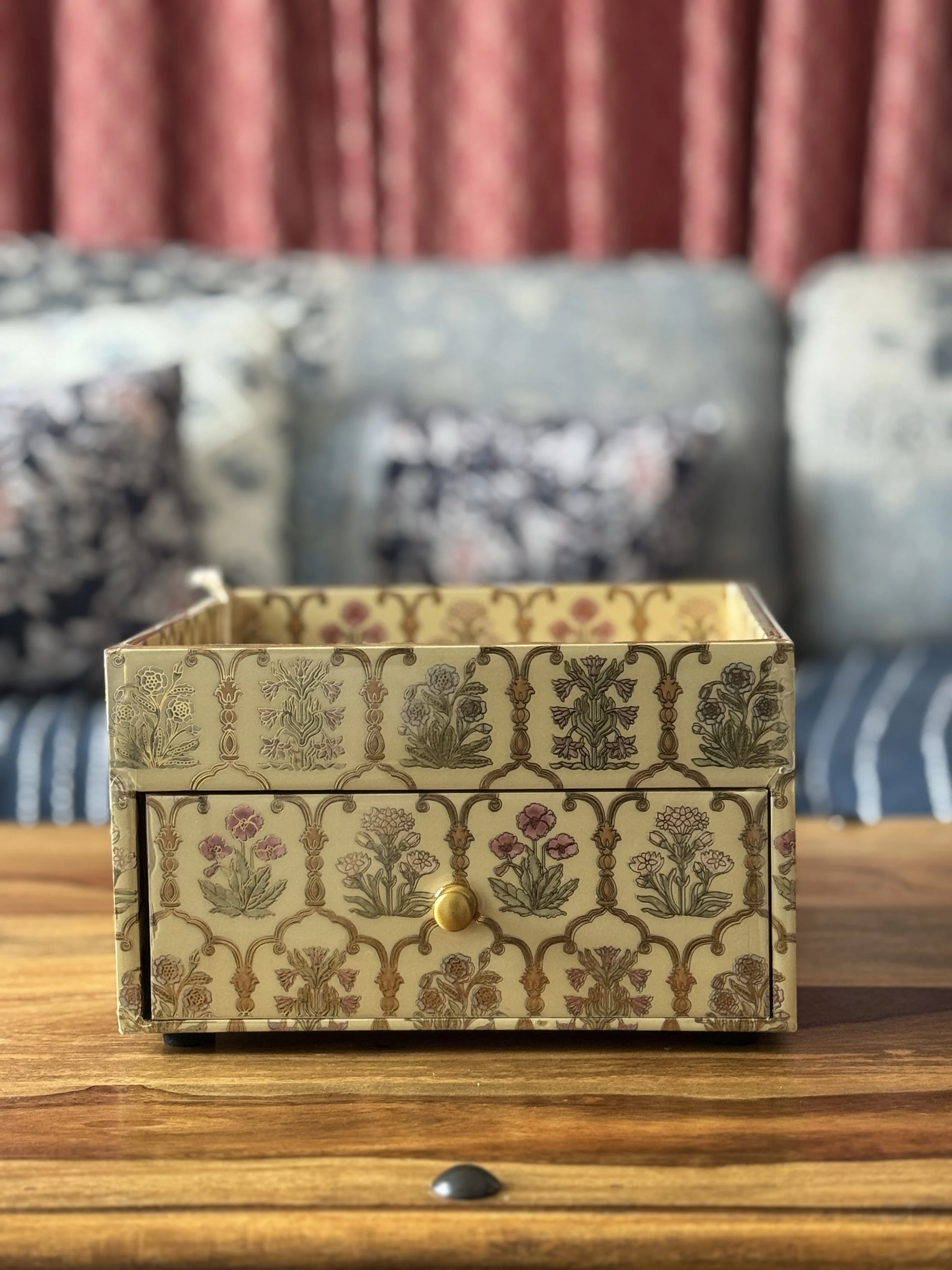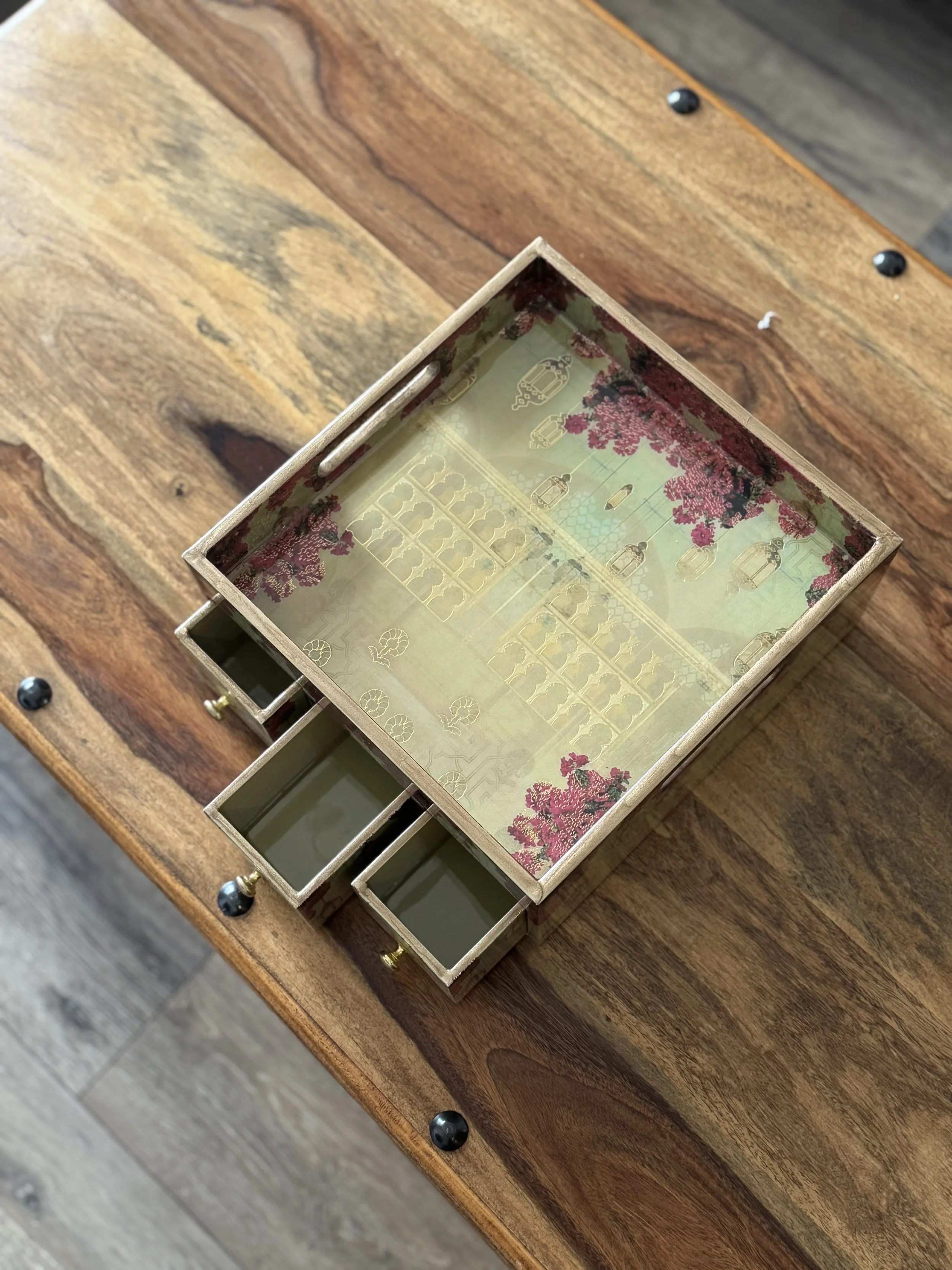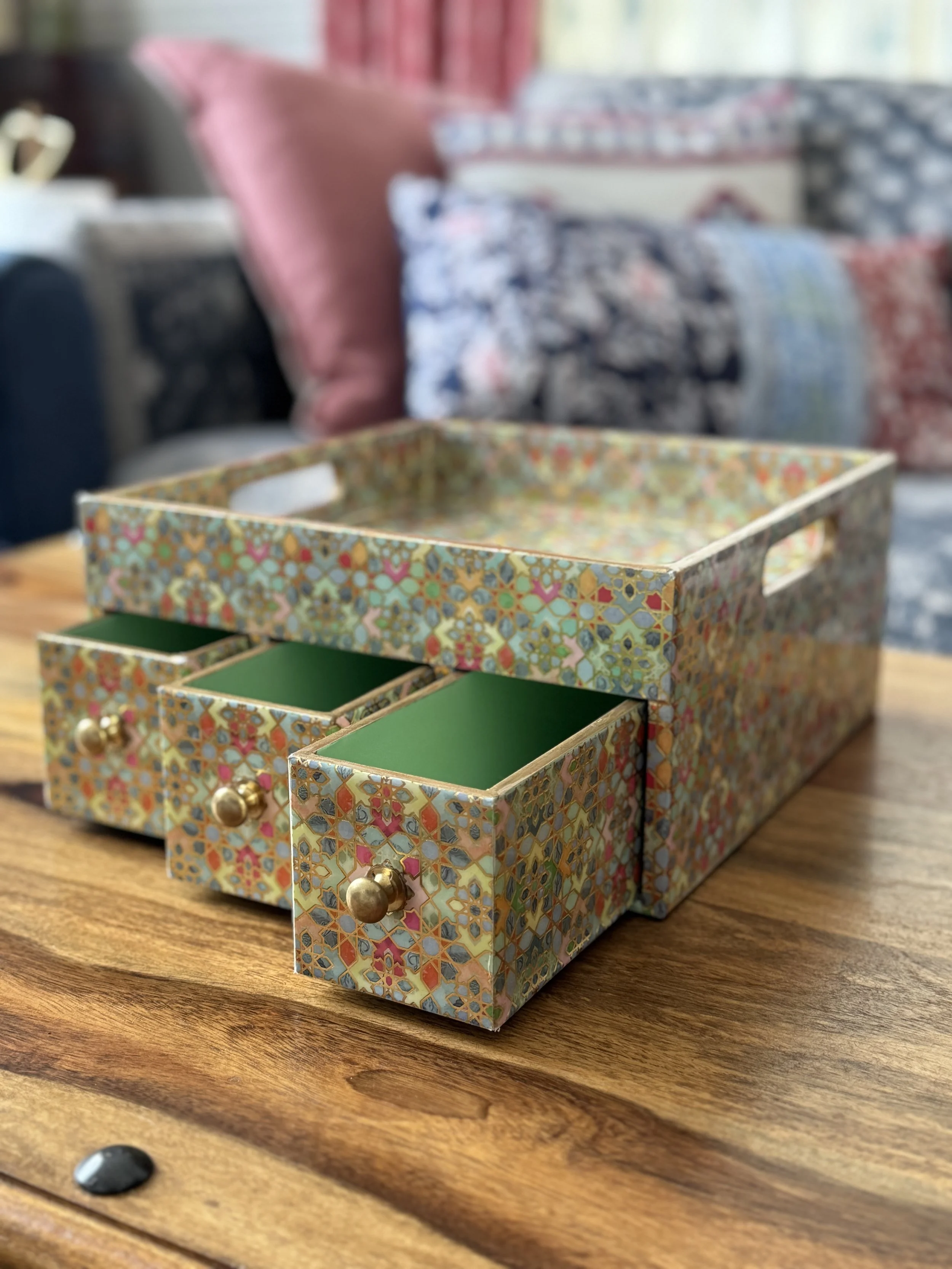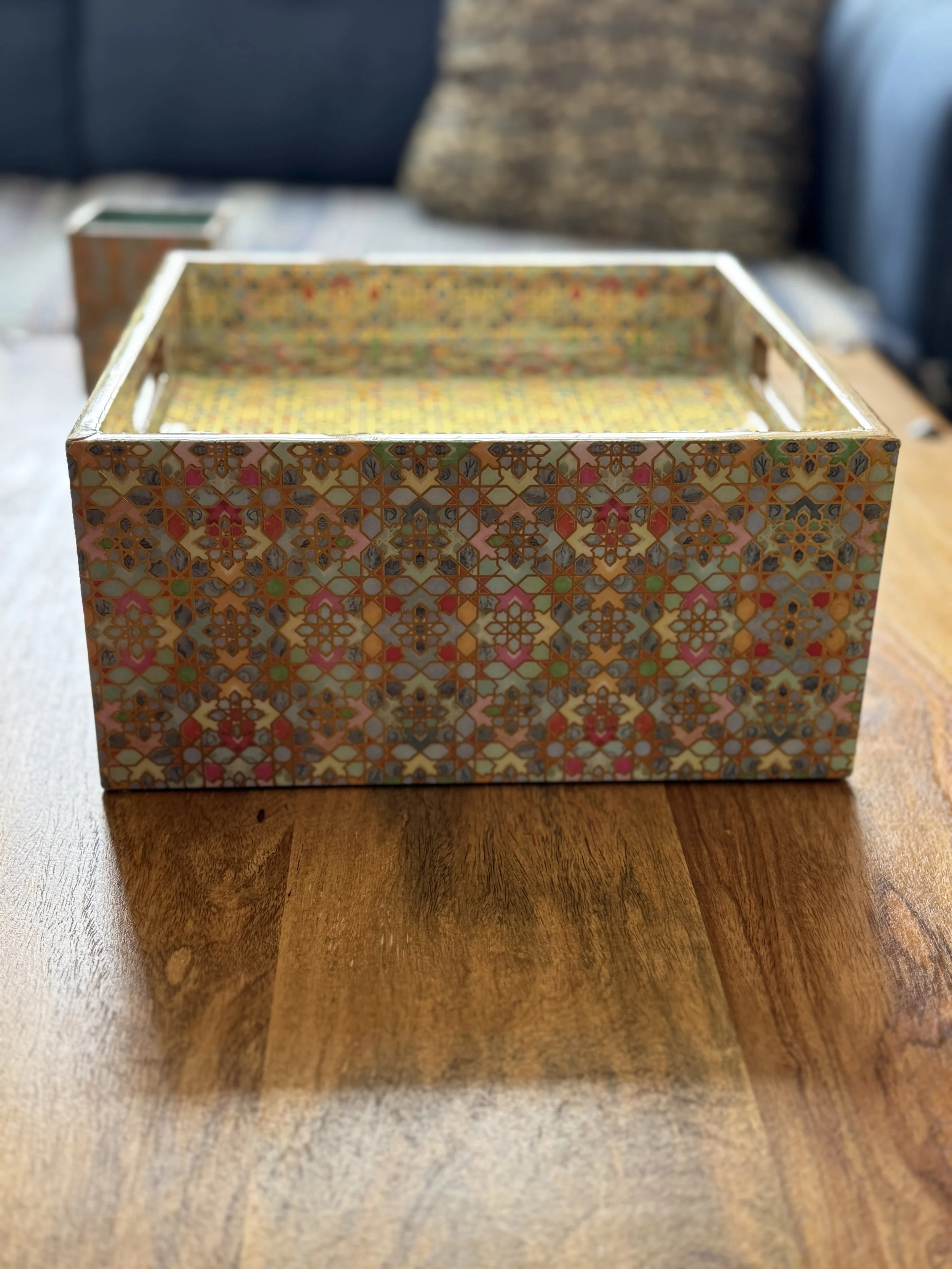 Elevate your snack game with our beautifully crafted mango wood platter, designed for effortless entertaining. Featuring a striking blue floral and bird motif, covered with enamel coating, this round platter comes with a built-in (detachable) central dip bowl, perfect for serving tortillas, chips, crackers, veggies — and of course, your favorite dips or salsas.