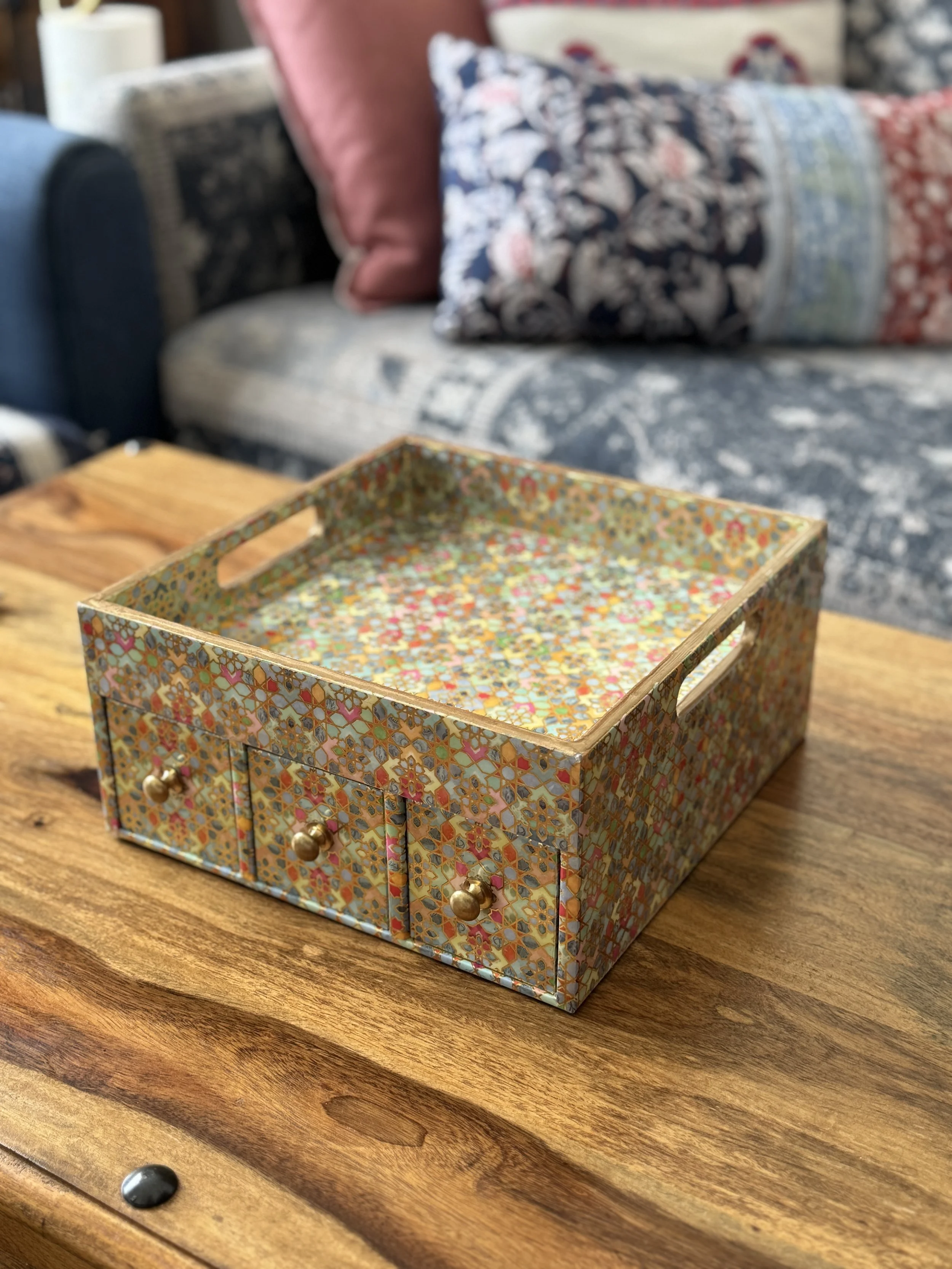 Elevate your desk organization with this two drawer organizer with a tray top, featuring gold tone knobs.