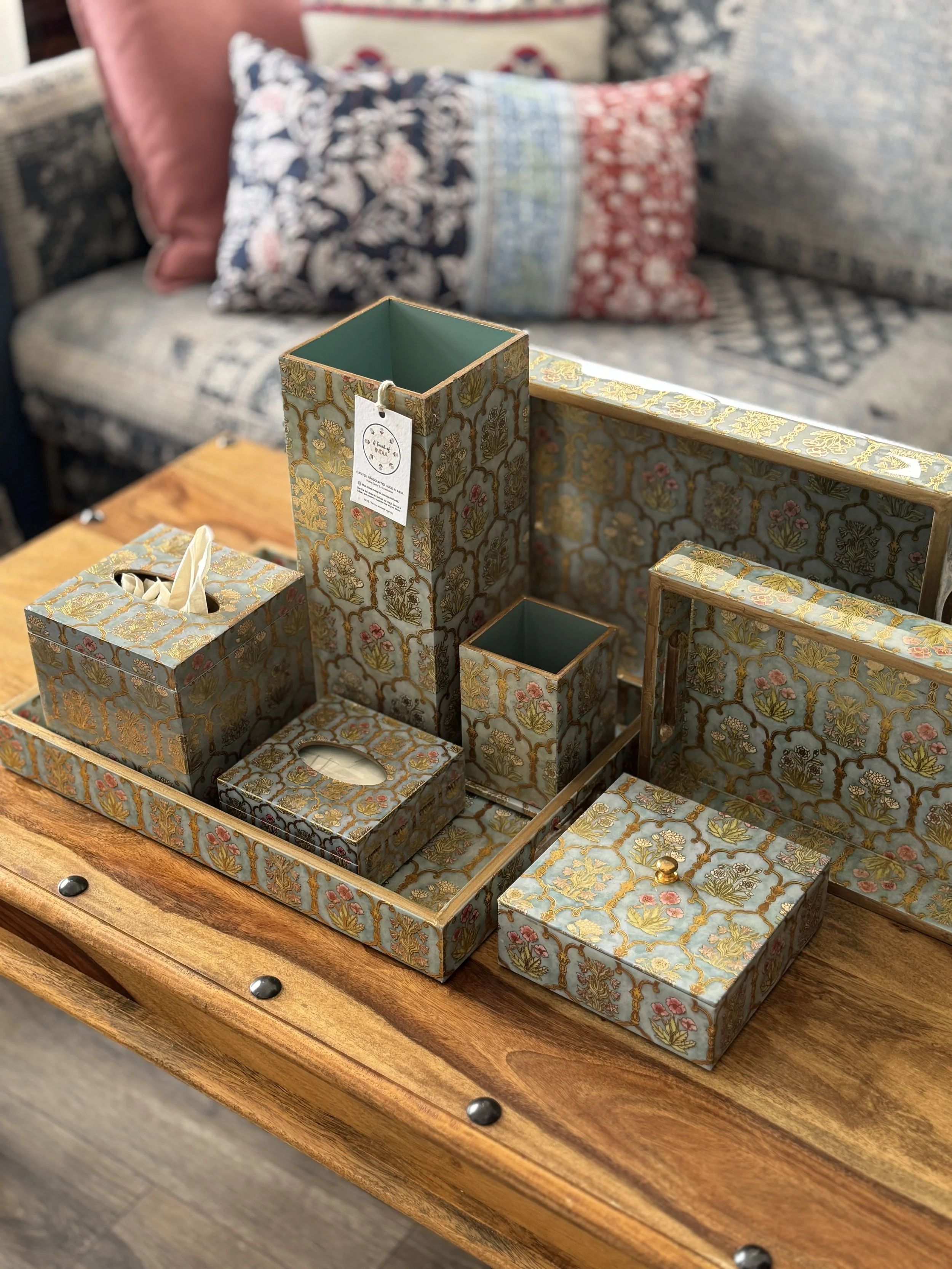 Lacquer coated range featuring Mahraab print, one of our bestsellers. Shown here are trays in all sizes, paper napkin box, cutlery holder, vase, and jewellery box