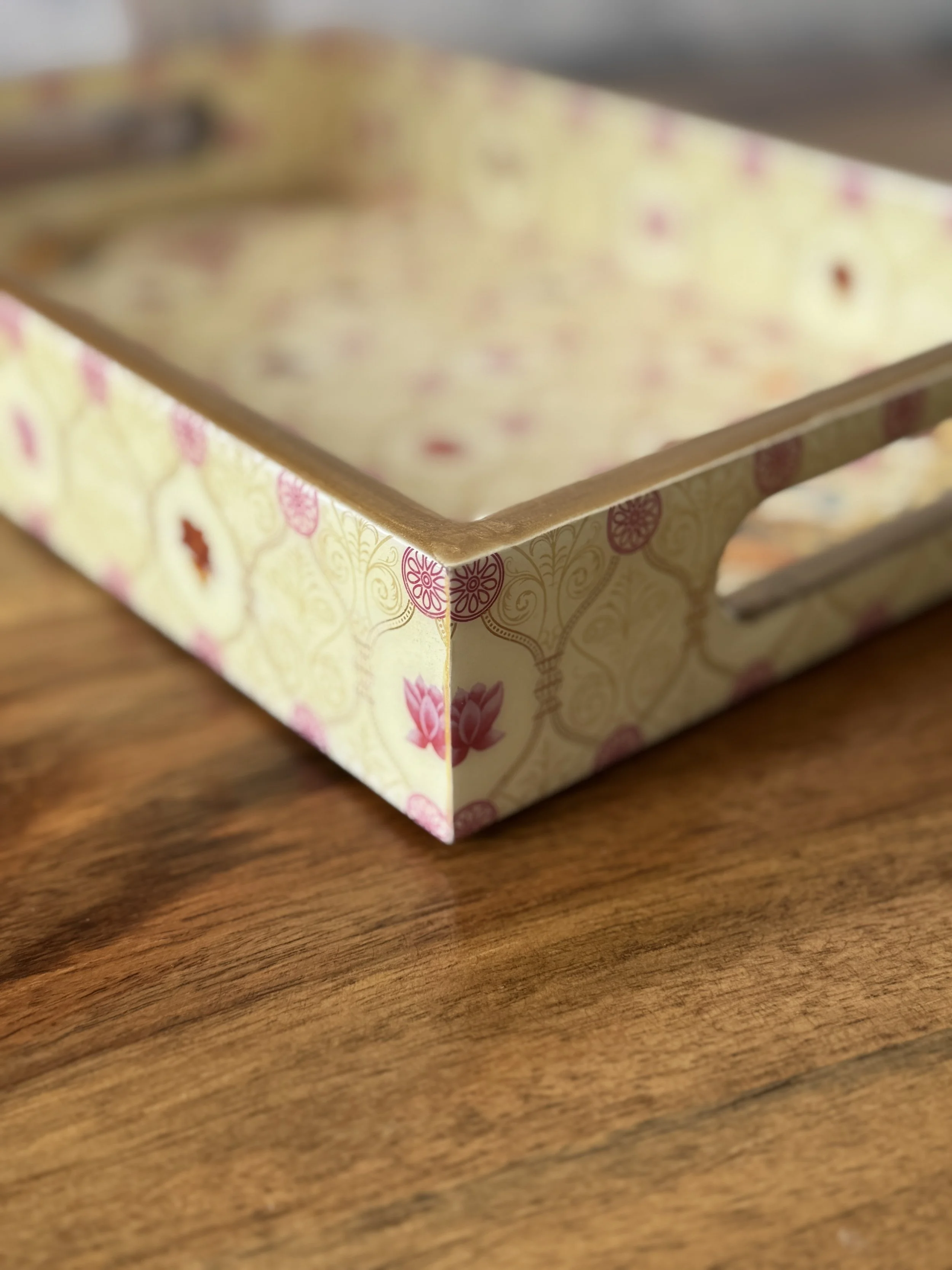 Crafted in wood and finished with a high-gloss lacquer, our décor items are water-resistant, durable, and furniture-friendly. Non-slip, anti-scratch pads ensure they stay put without leaving marks. Intricate floral motifs, metallic accents, and rich textures bring a touch of India to every corner of your home.